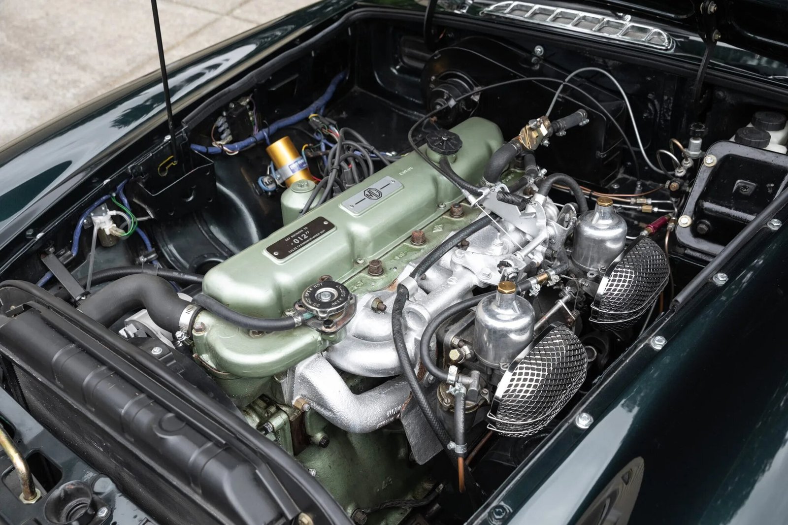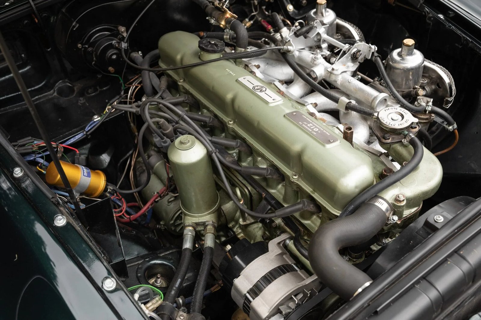The 2.9-liter inline-six is equipped with dual SU carburetors and was overhauled. The oil was changed and the battery was replaced in preparation for sale. Power is sent to the rear wheels through a four-speed manual transmission with overdrive, both of which have been refurbished.