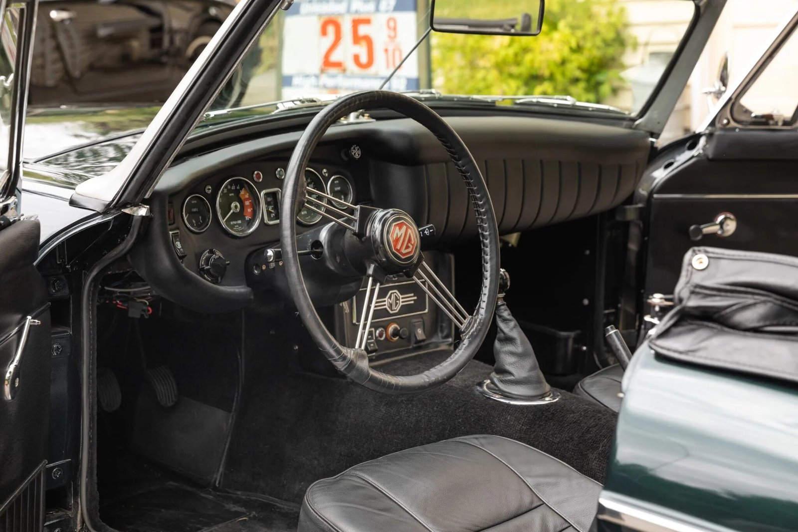 This 1969 MG MGC roadster have been the subject of a refurbishment which included a repaint in green, replacement of exterior trim and seals, and reupholstery of the interior in black leather. Additional work consisted of refreshing the suspension, braking, and fuel systems as well as rebuilding the 2.9-liter inline-six, four-speed manual transmission, and overdrive. Features include a replacement black soft top, chrome bumpers, silver-finished 15″ wire wheels, uprated front disc brakes, dual SU carburetors, and a banjo-style steering wheel.