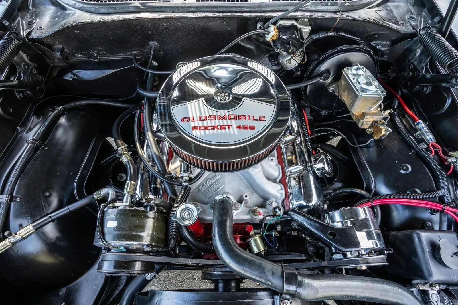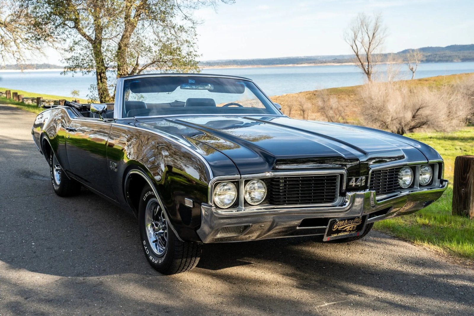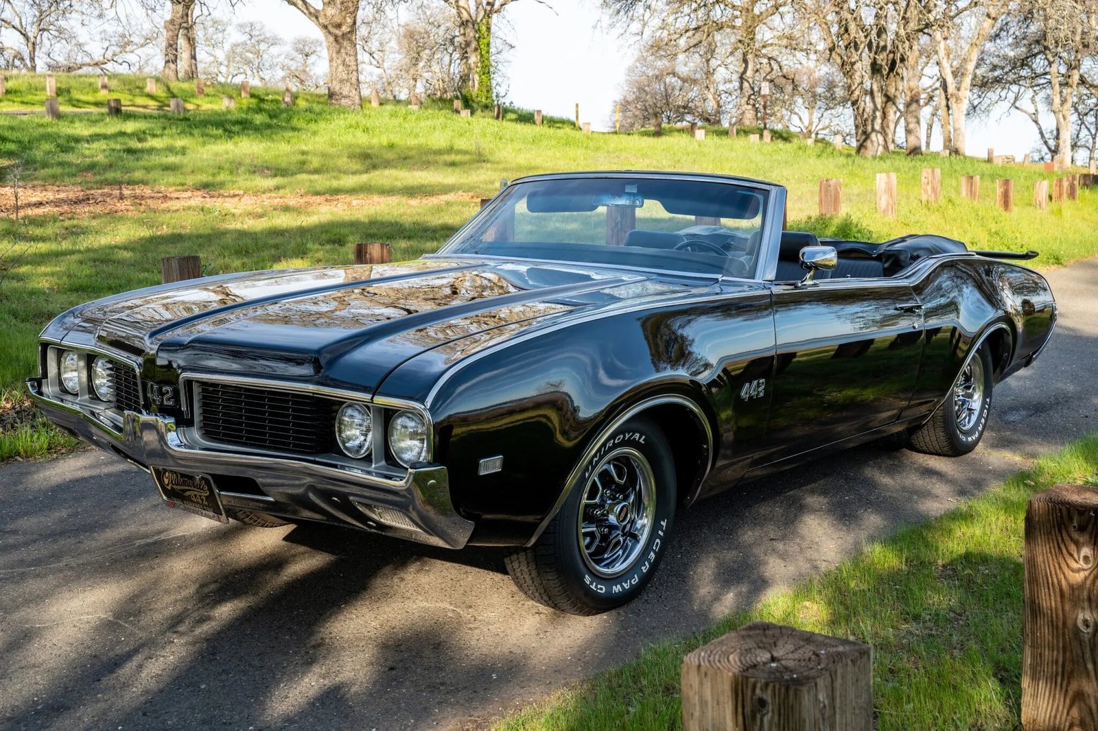 This 1969 Oldsmobile 442 convertible is finished in black over black and powered by a replacement 455ci V8 paired with a four-speed manual transmission and a 12-bolt rear axle.