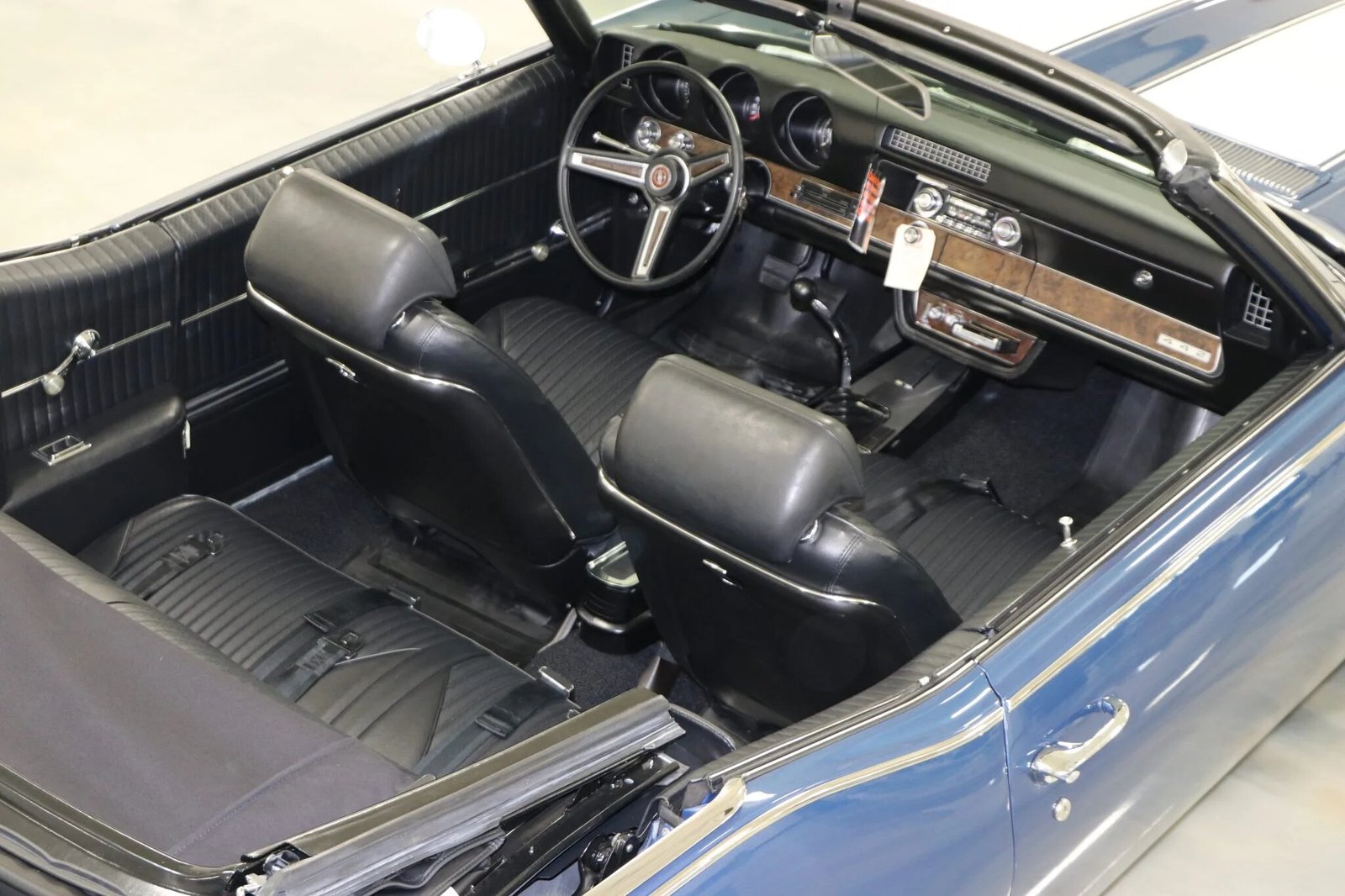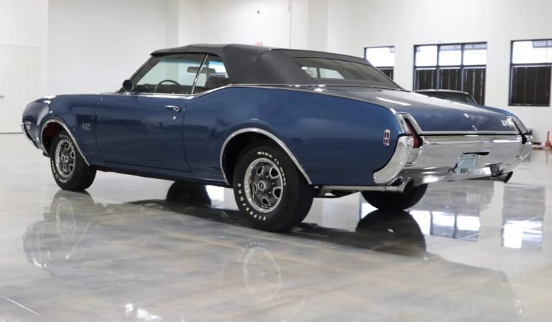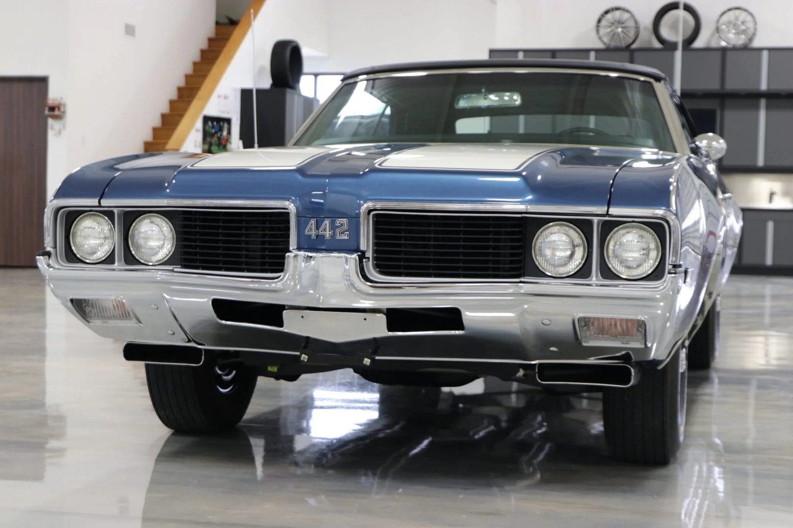 This 1969 Oldsmobile 442 convertible is finished in Trophy Blue with white stripes over black and powered by a 400ci V8 mated to a Muncie M21 four-speed close-ratio manual transmission and a 12-bolt rear axle with 3.91:1 gears.