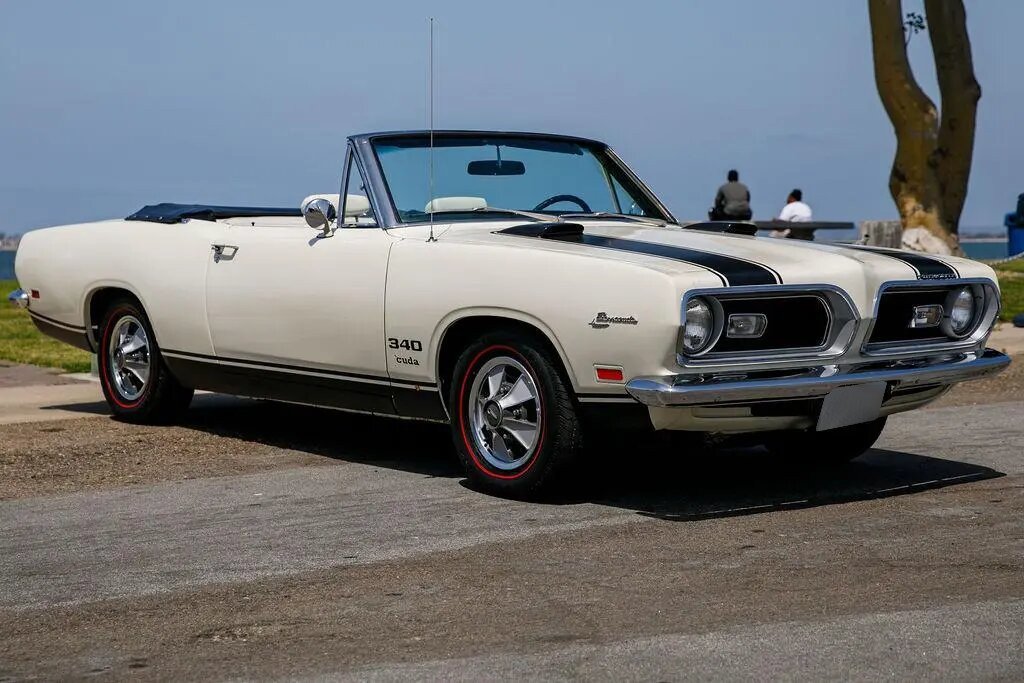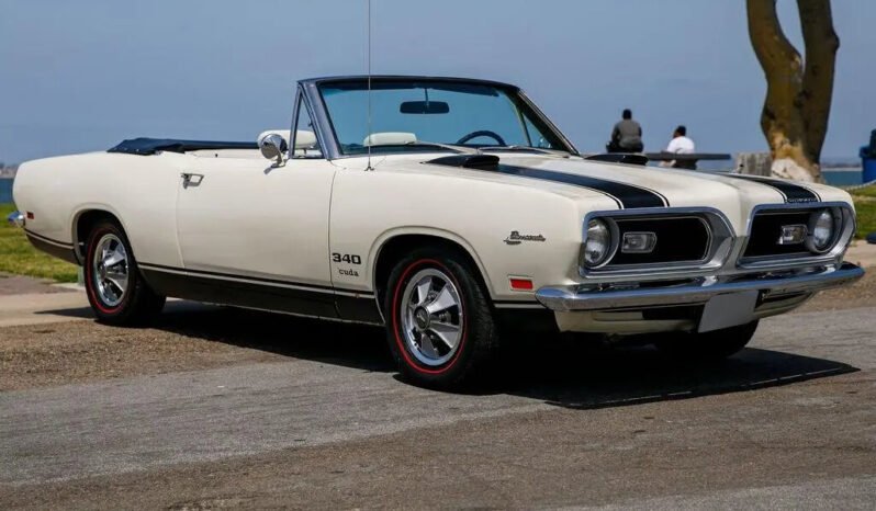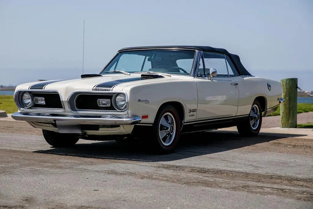 This 1969 Plymouth Barracuda convertible is finished in white over white vinyl upholstery and powered by a replacement 360ci V8 paired with a three-speed automatic transmission.