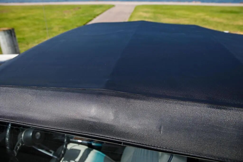 Equipment includes a power-operated black soft top, 14″ wheels with redline tires, black hood stripes, hood scoops, chrome bumpers, and a JVC stereo wired to aftermarket speakers.