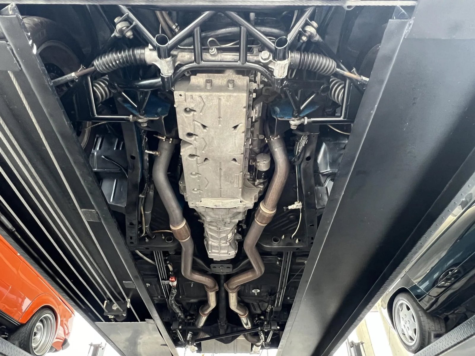 Aftermarket 18″ wheels are mounted with Michelin tires. Wilwood cross-drilled disc brakes have been added with six-piston calipers up front. Other details include a Magnum Force four-link suspension and coilovers all around.