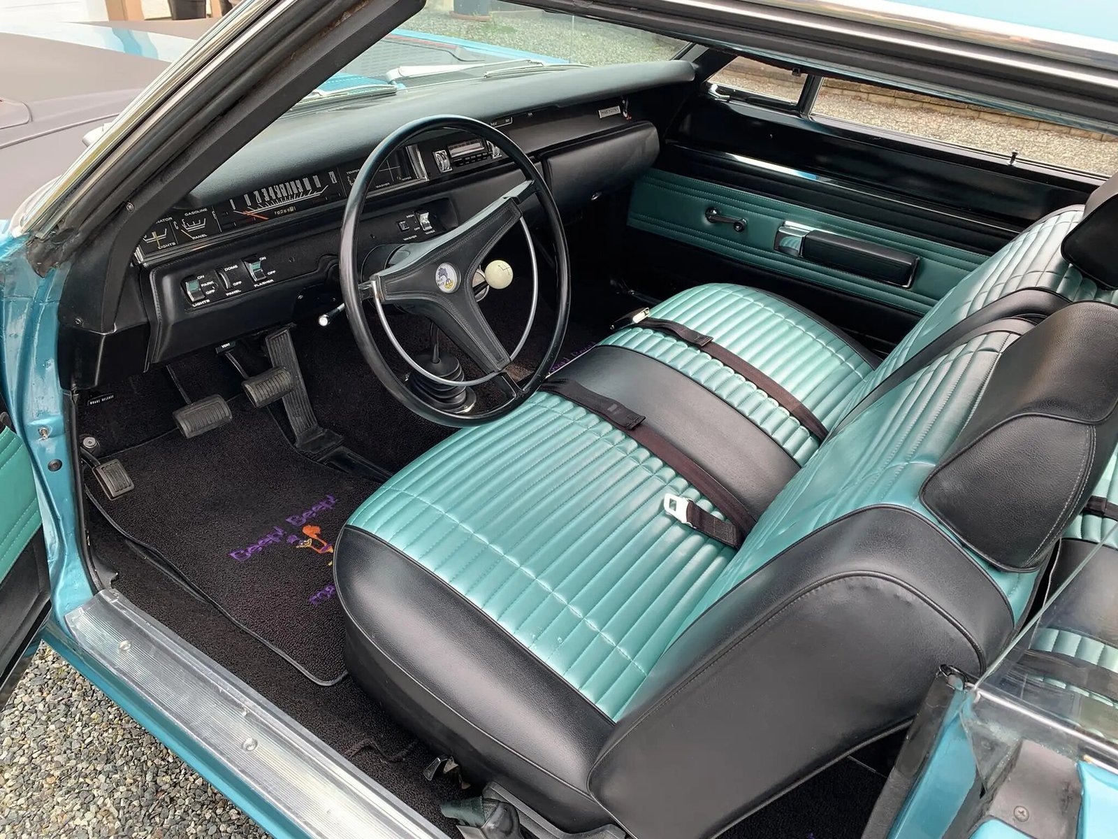 An oil pressure gauge is mounted below the dash, and additional equipment includes a Chrysler solid-state AM radio and lap-belts for the front and rear occupants.