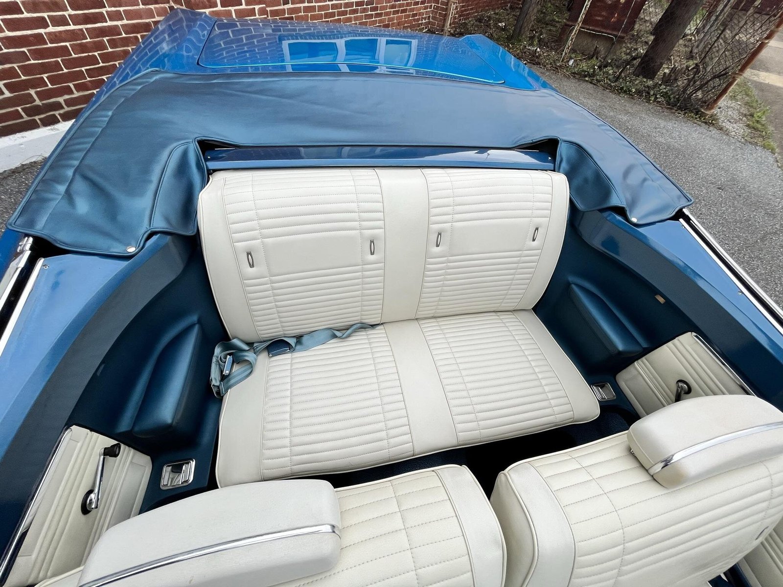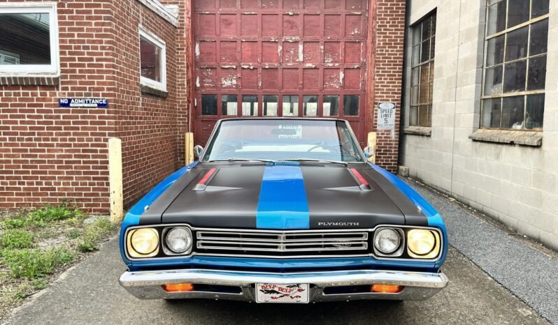 This 1969 Plymouth Road Runner convertible was refurbished and is powered by an overbored 383ci V8 mated to a three-speed automatic transmission. The car is finished in blue over white vinyl upholstery and features include a white convertible top, power steering, power front disc brakes, Magnum 500–style 15″ wheels, BFGoodrich red-line tires, a push-button AM radio, Mopar electronic ignition, Hooker exhaust headers, and an Edelbrock intake manifold, four-barrel carburetor, and aluminum cylinder heads.