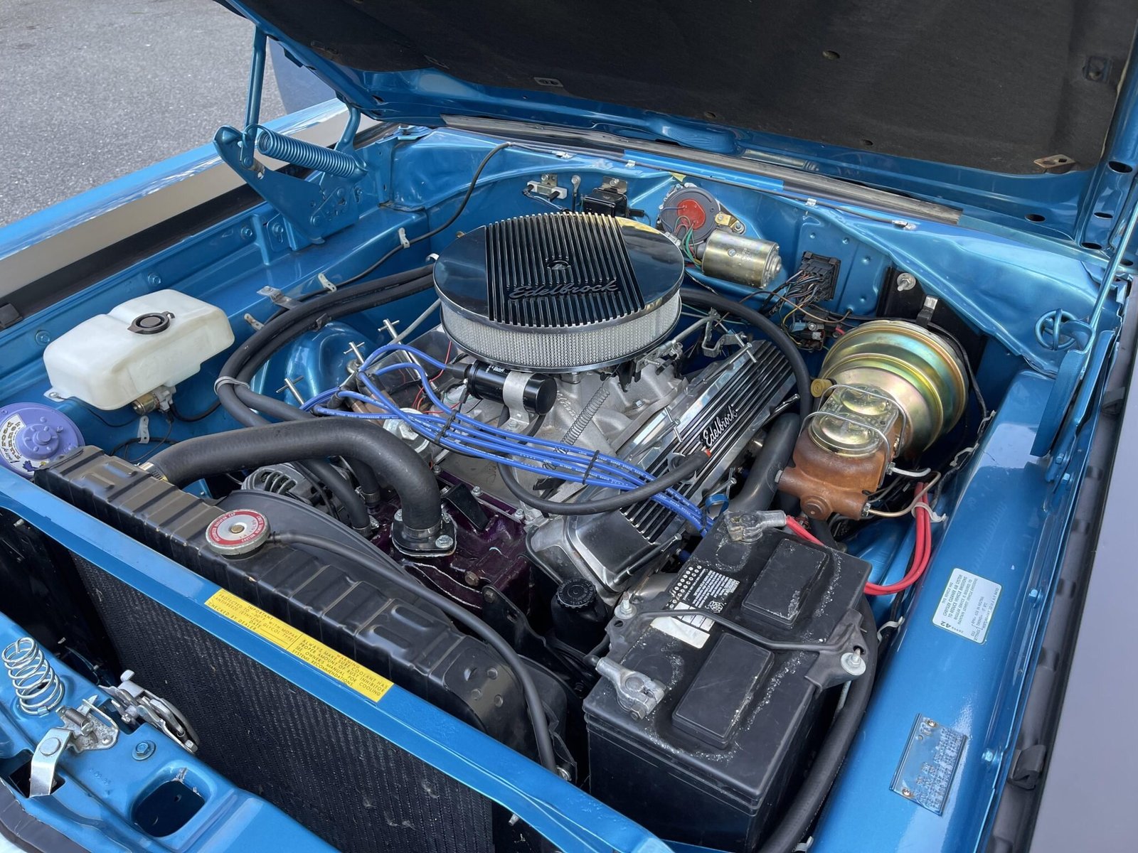 The engine retain the factory crankshaft and connecting rods and also is fitted with an Edelbrock roller camshaft, roller rockers, and rocker shafts.