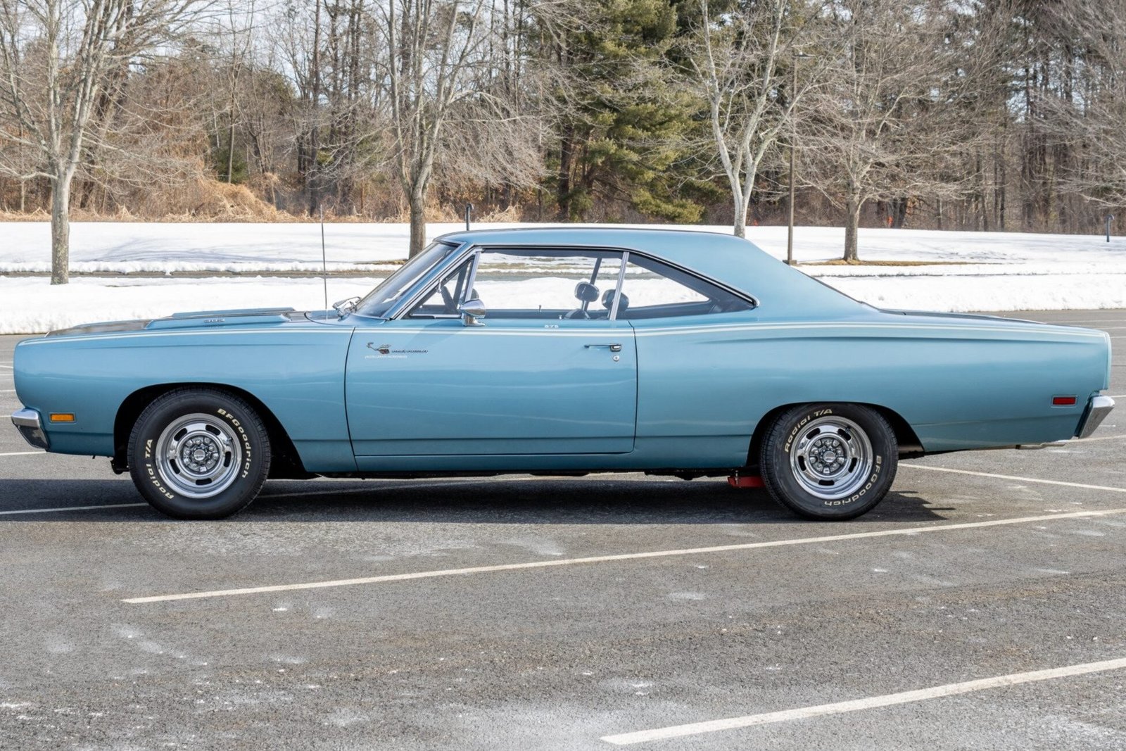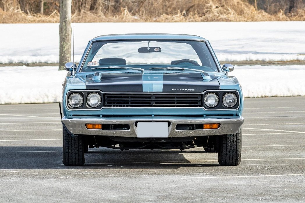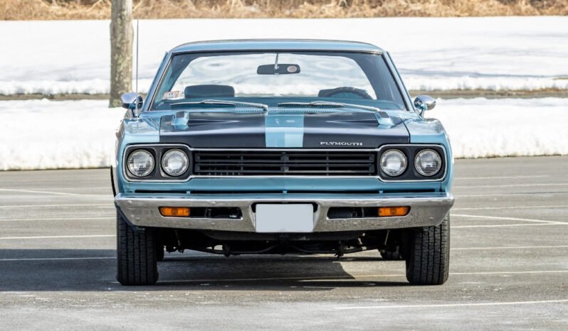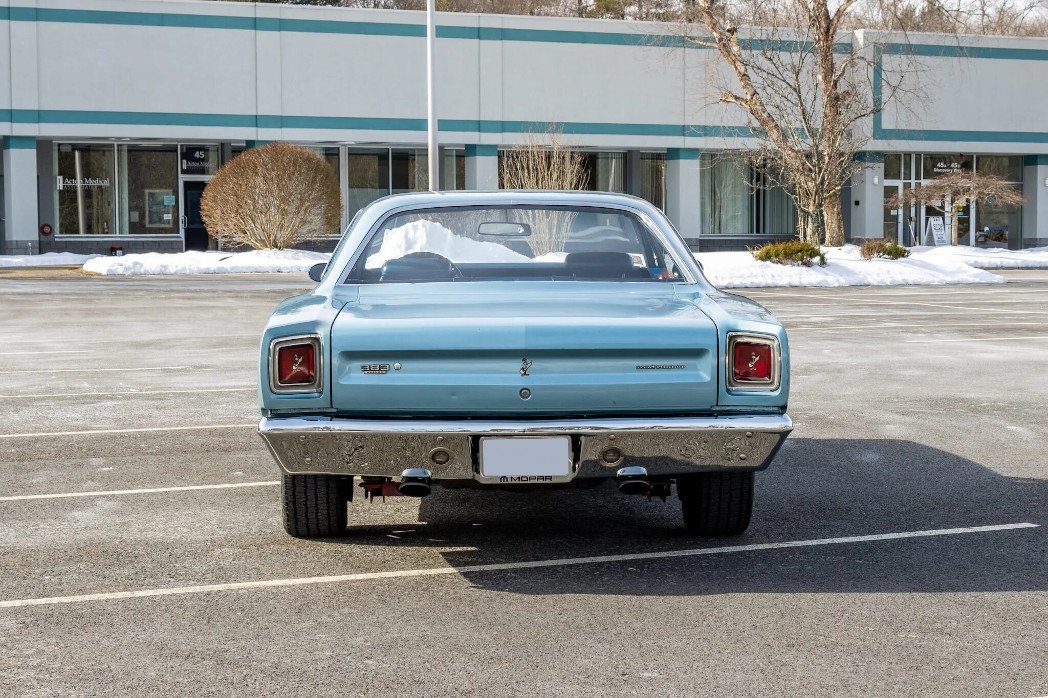 The car is finished in light blue and features black racing stripes on the hood, white sport stripes, and the Road Runner Decor Group, which added Road Runner badging and lettering as well as emblems in the center of the taillights.
