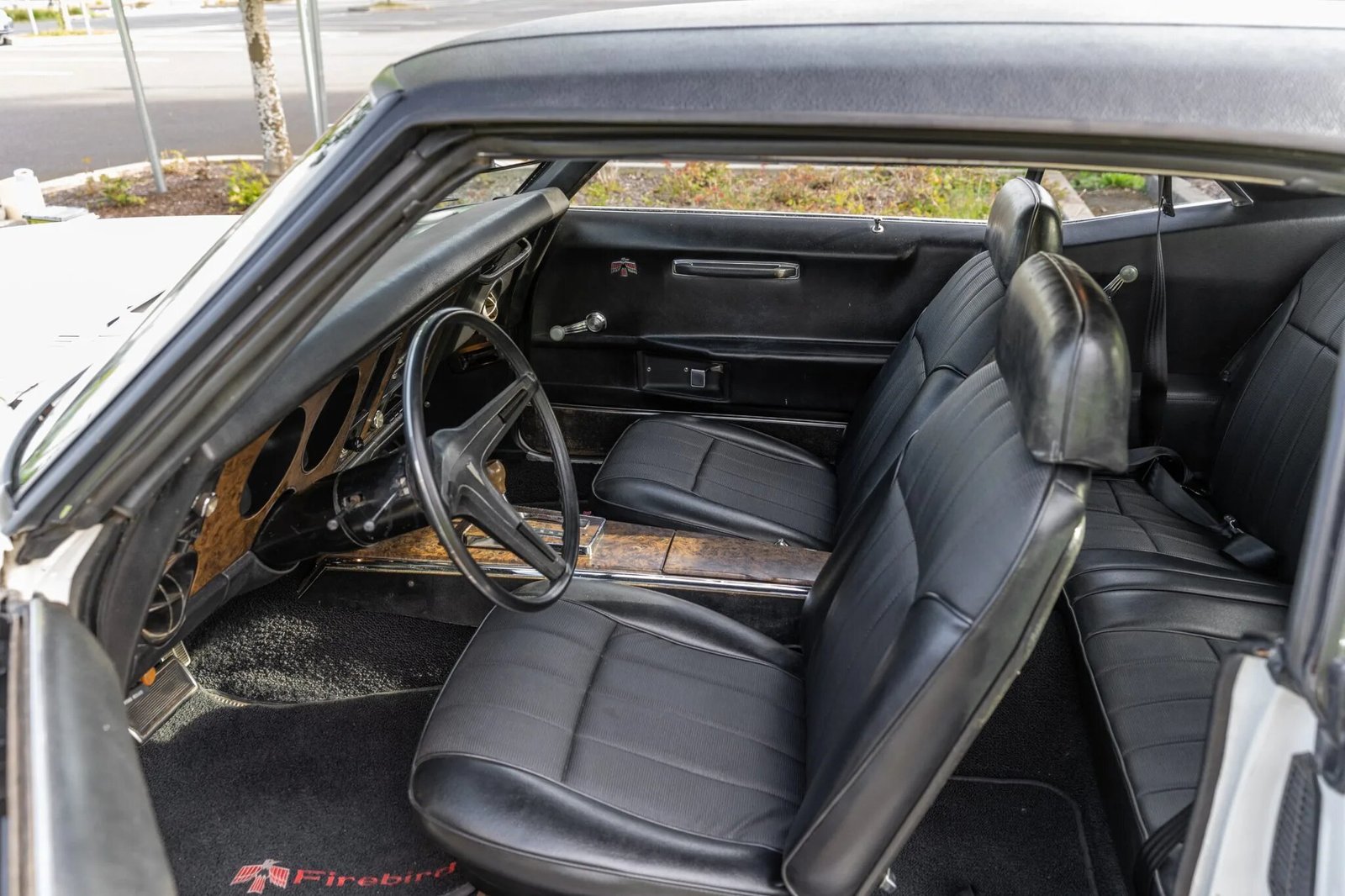 The interior features black vinyl-covered seats along with woodgrain trim on the center console and instrument panel.