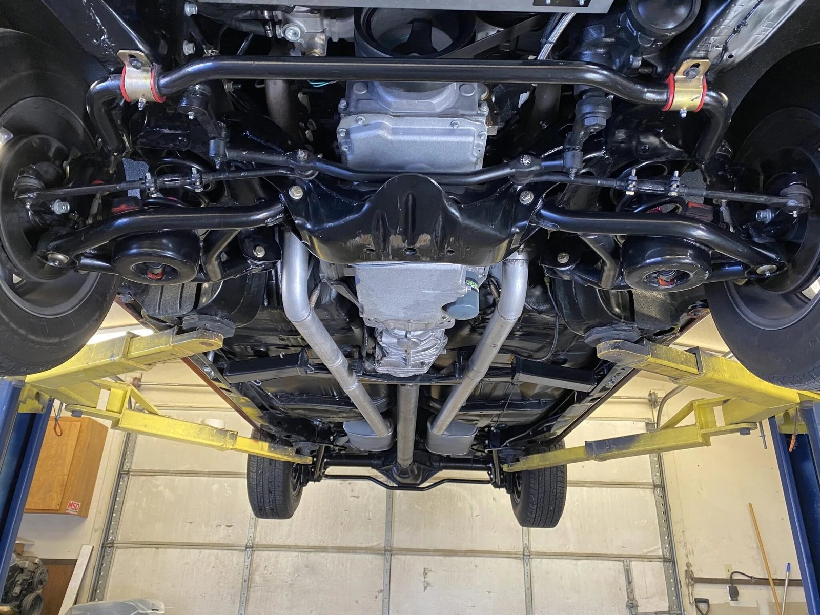 The car is equipped with a quick-ratio power steering box, tubular front control arms, stainless steel brake lines, braided brake hoses, and upgraded anti swaybars.