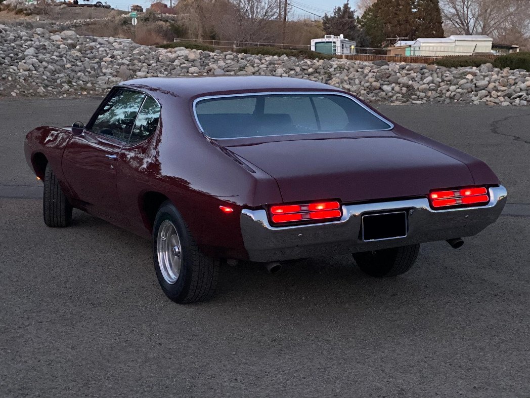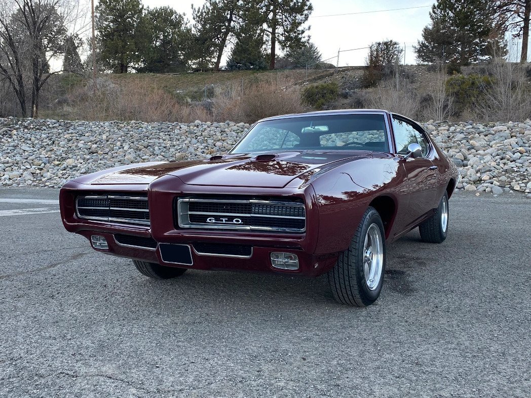 This 1969 Pontiac GTO is finished in burgundy over black and powered by a 5.3-liter LM7 V8 paired with a Tremec TKO 600 five-speed manual transmission and a 12-bolt Safe-T-Trak rear axle.