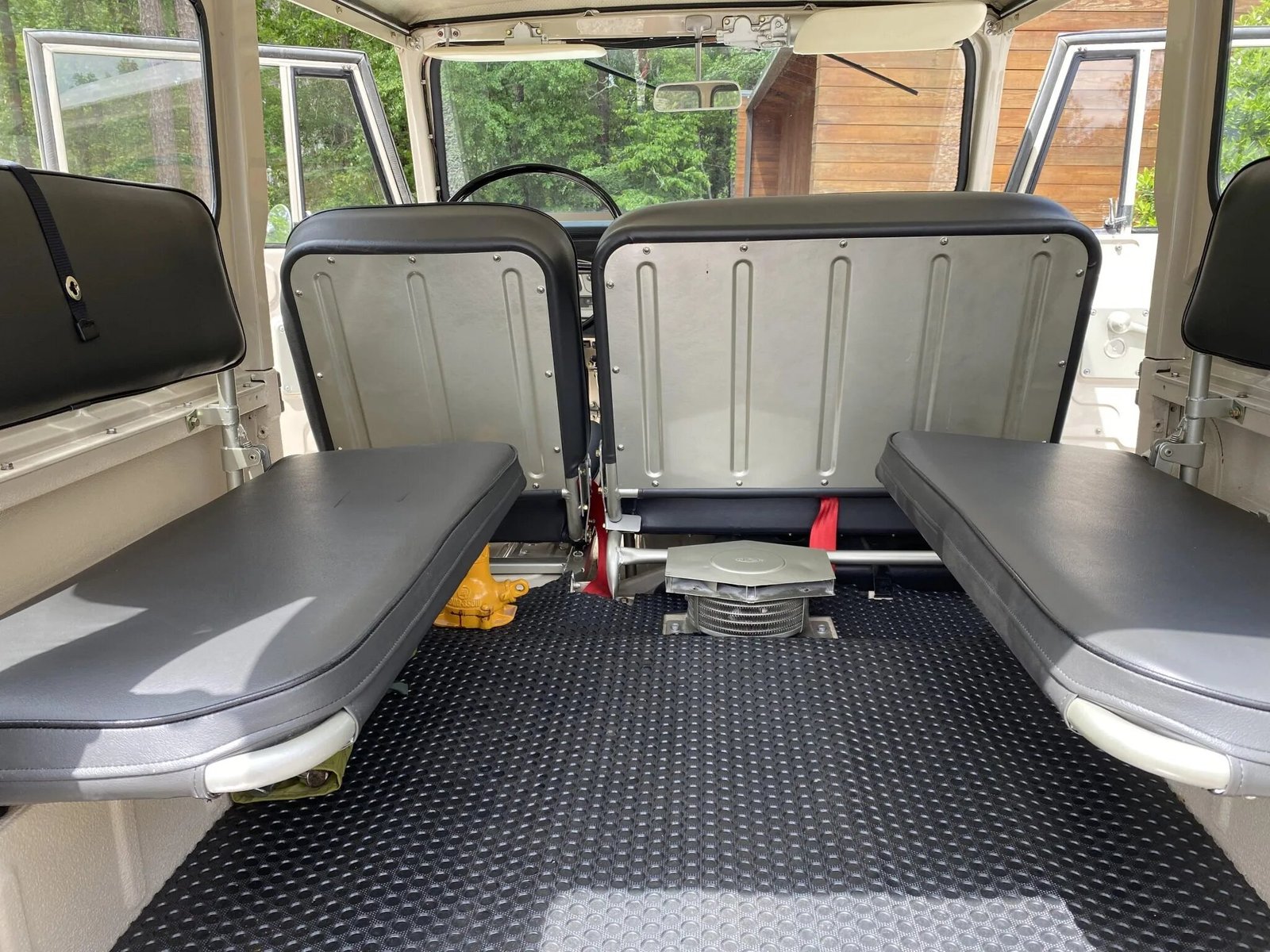 The cabin features a split front bench seat and inward-facing rear seats that were rebuilt and recovered during the refurbishment.
