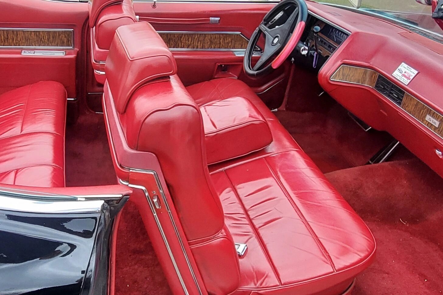 The cabin features seating surfaces trimmed in red tufted leather with a matching dash pad, door panels, and carpets.