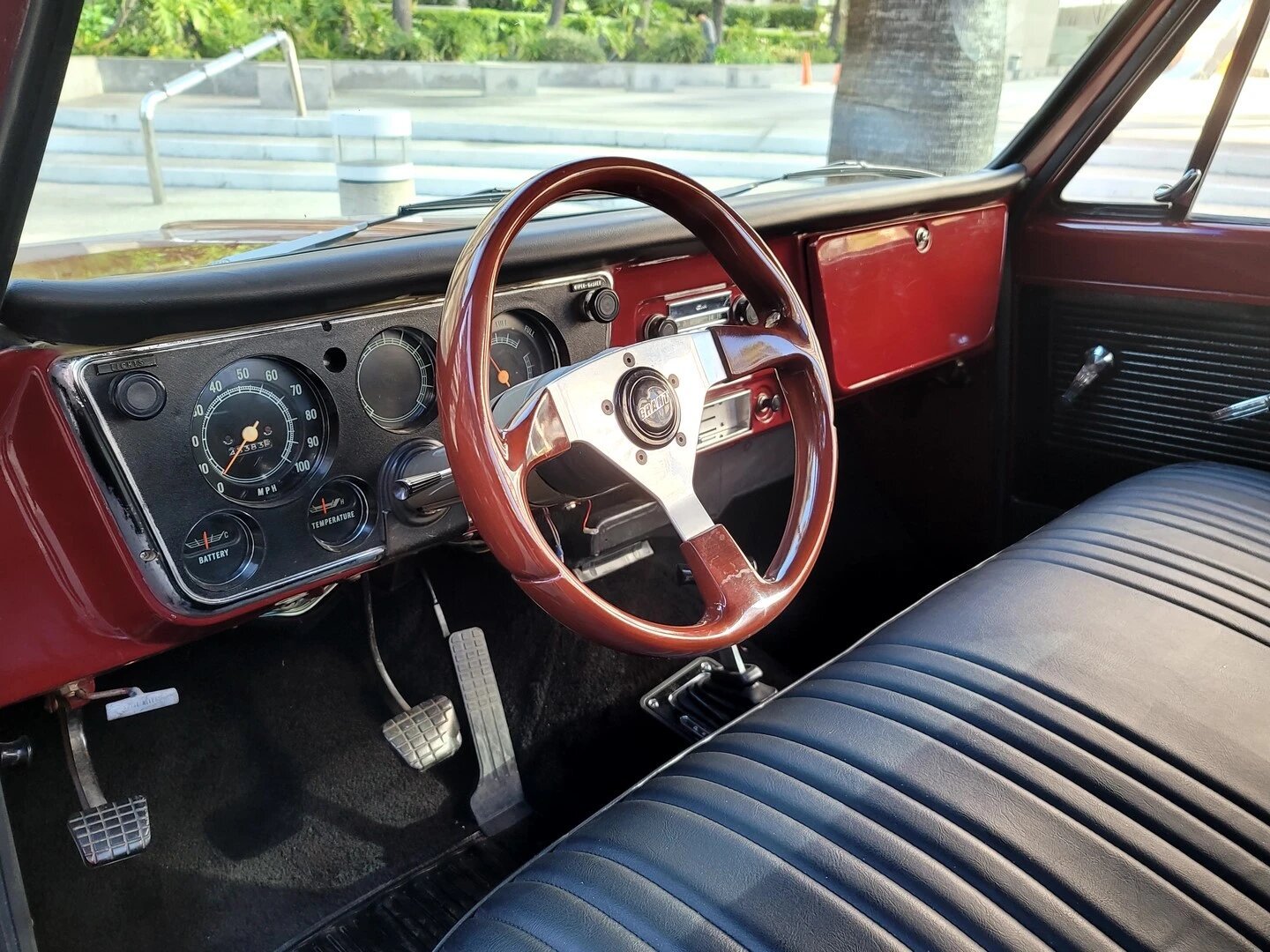 Sheetmetal surfaces are finished in body color, and additional amenities include manual-crank side windows, a glove compartment, power steering, a B&M shifter, and a push-button radio.