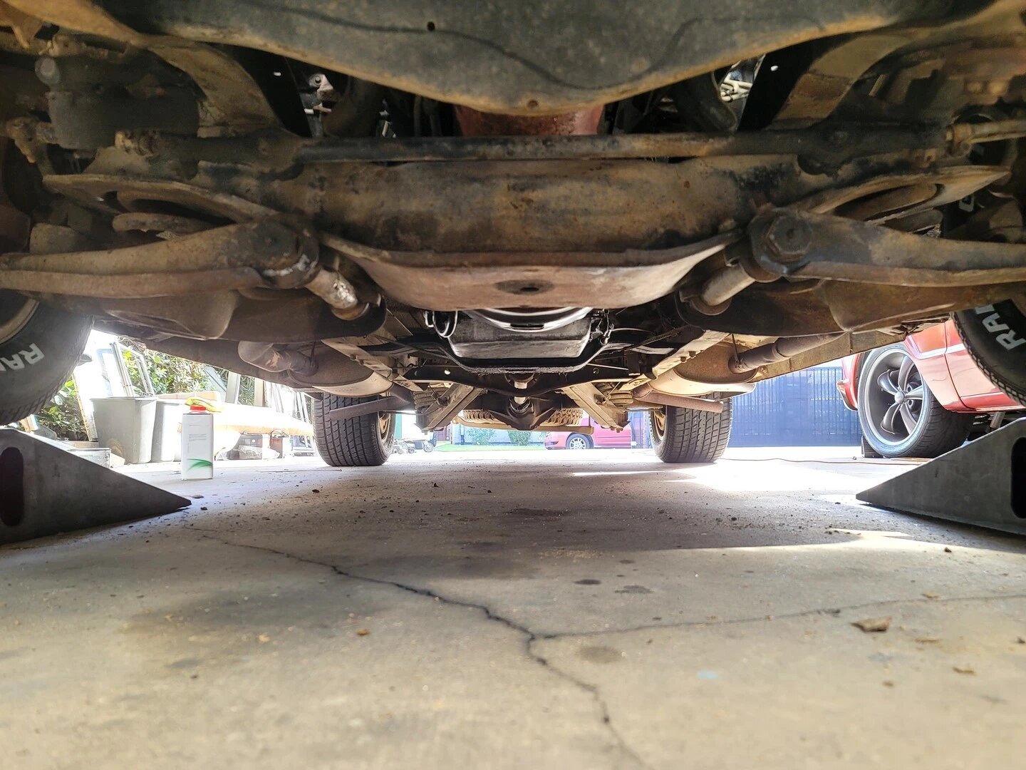 Staggered-width 15″ slotted alloy wheels are mounted with Cooper Cobra tires.