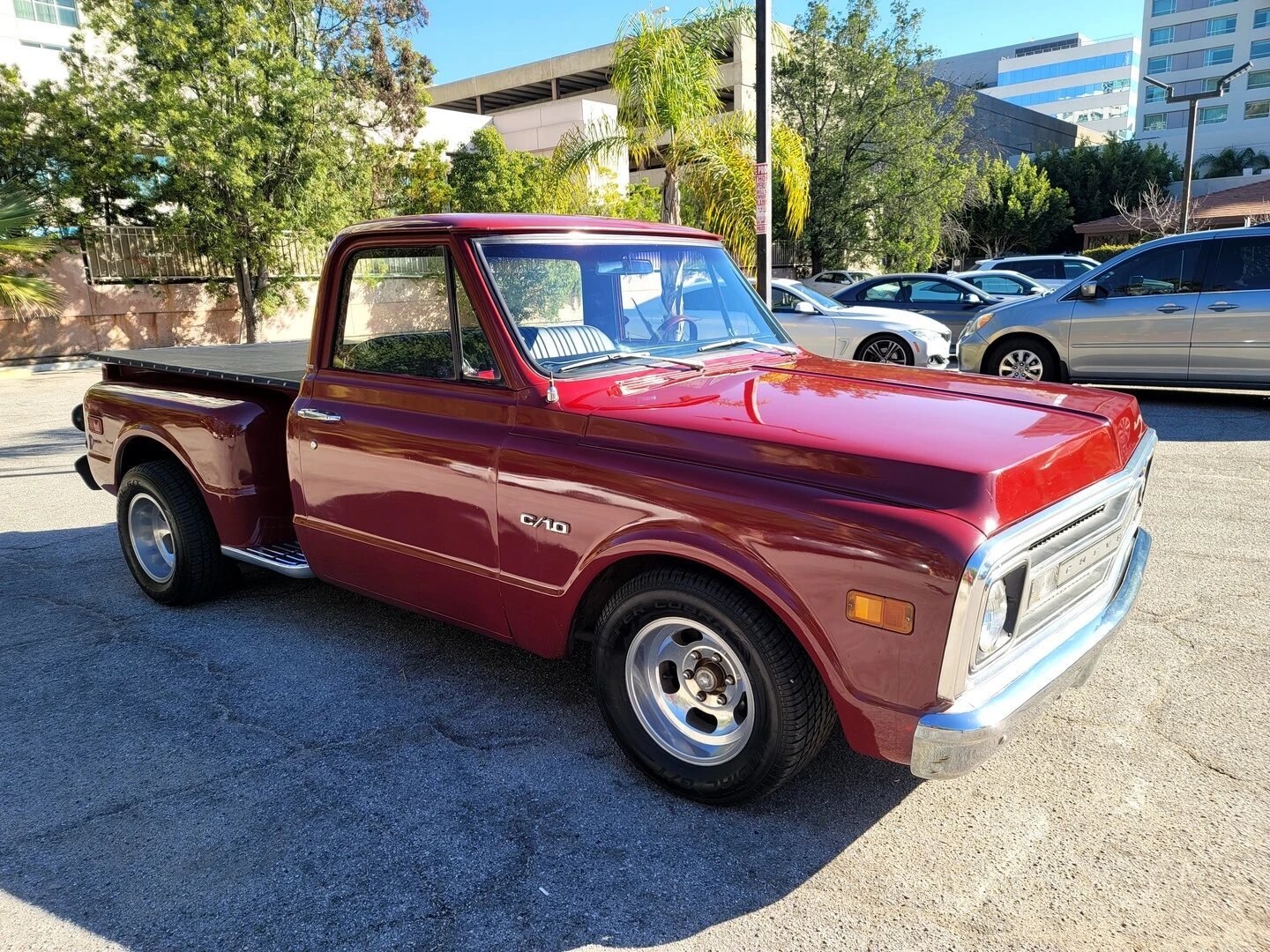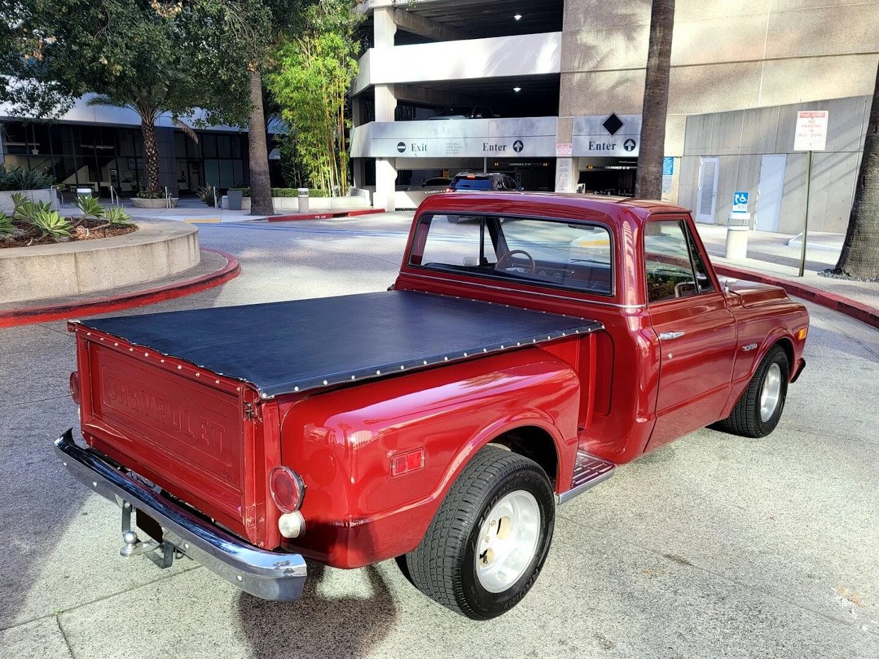 This 1970 Chevrolet C10 is a stepside pickup that is finished in red over black upholstery and powered by a replacement 350ci V8 paired with a three-speed Turbo Hydra-Matic automatic transmission.