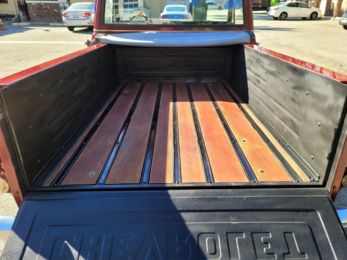 Features include chrome bumpers and trim, a driver-side mirror, a black tonneau cover, exhaust outlets exiting in front of each rear tire, a wood-plank bed floor, and a tailgate with raised “Chevrolet” lettering.