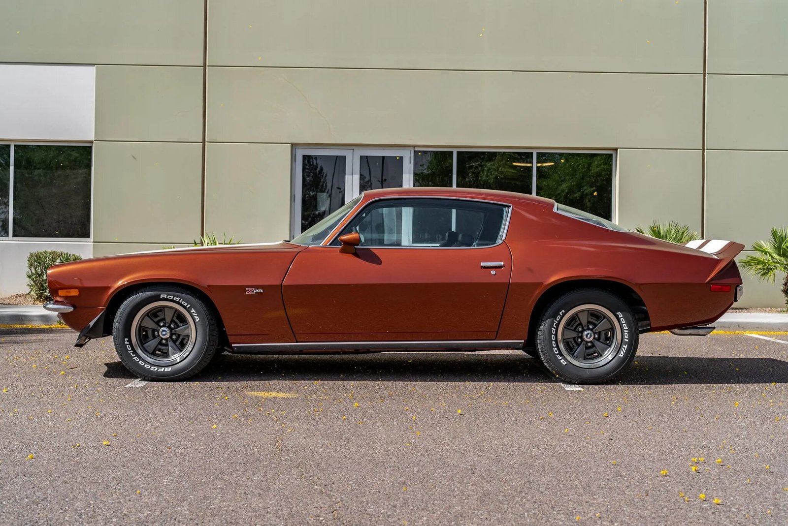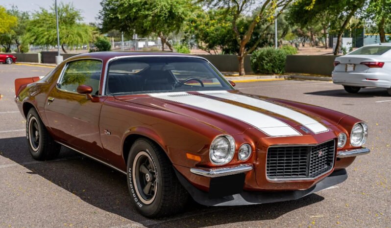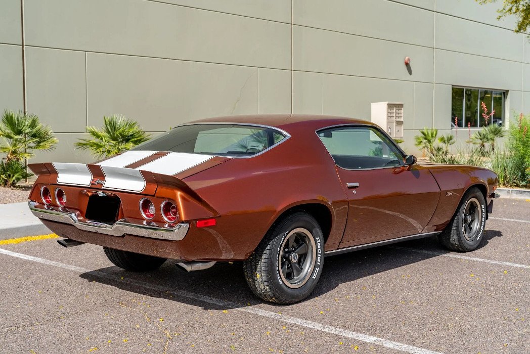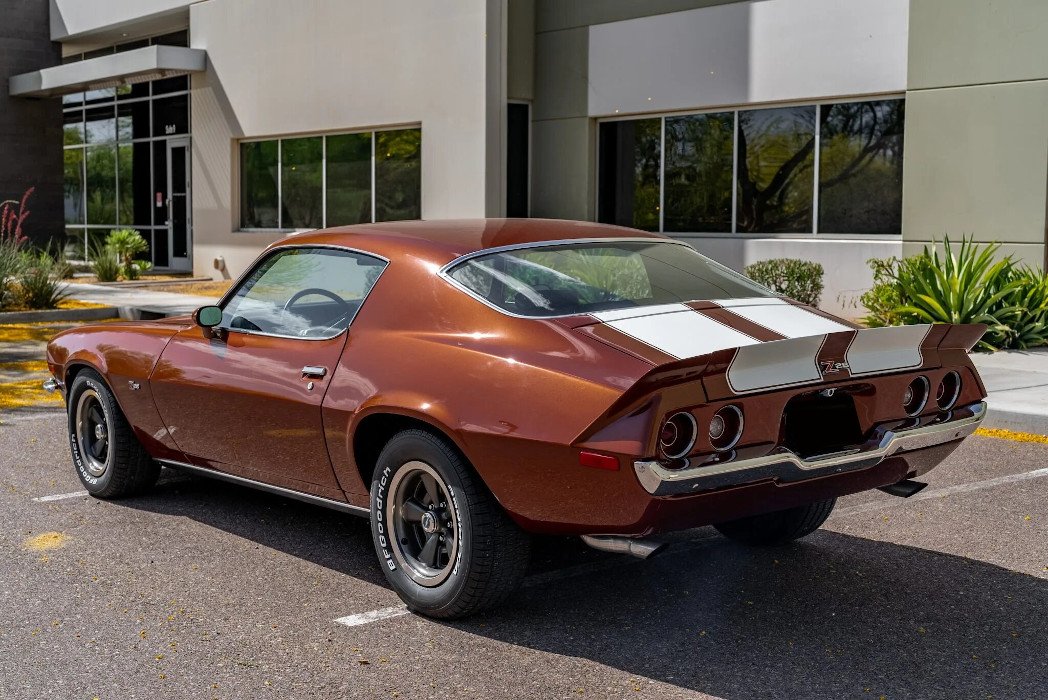 Features include a split front bumper, Z28 badging, white stripes, a front spoiler, and a COPO 9697-style rear spoiler.