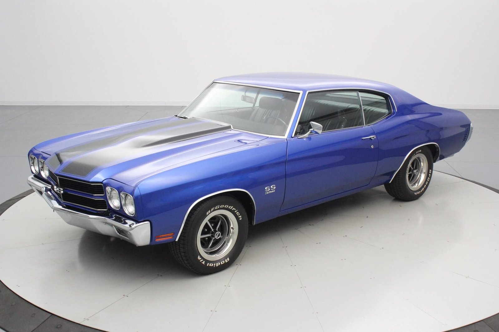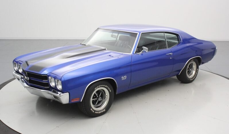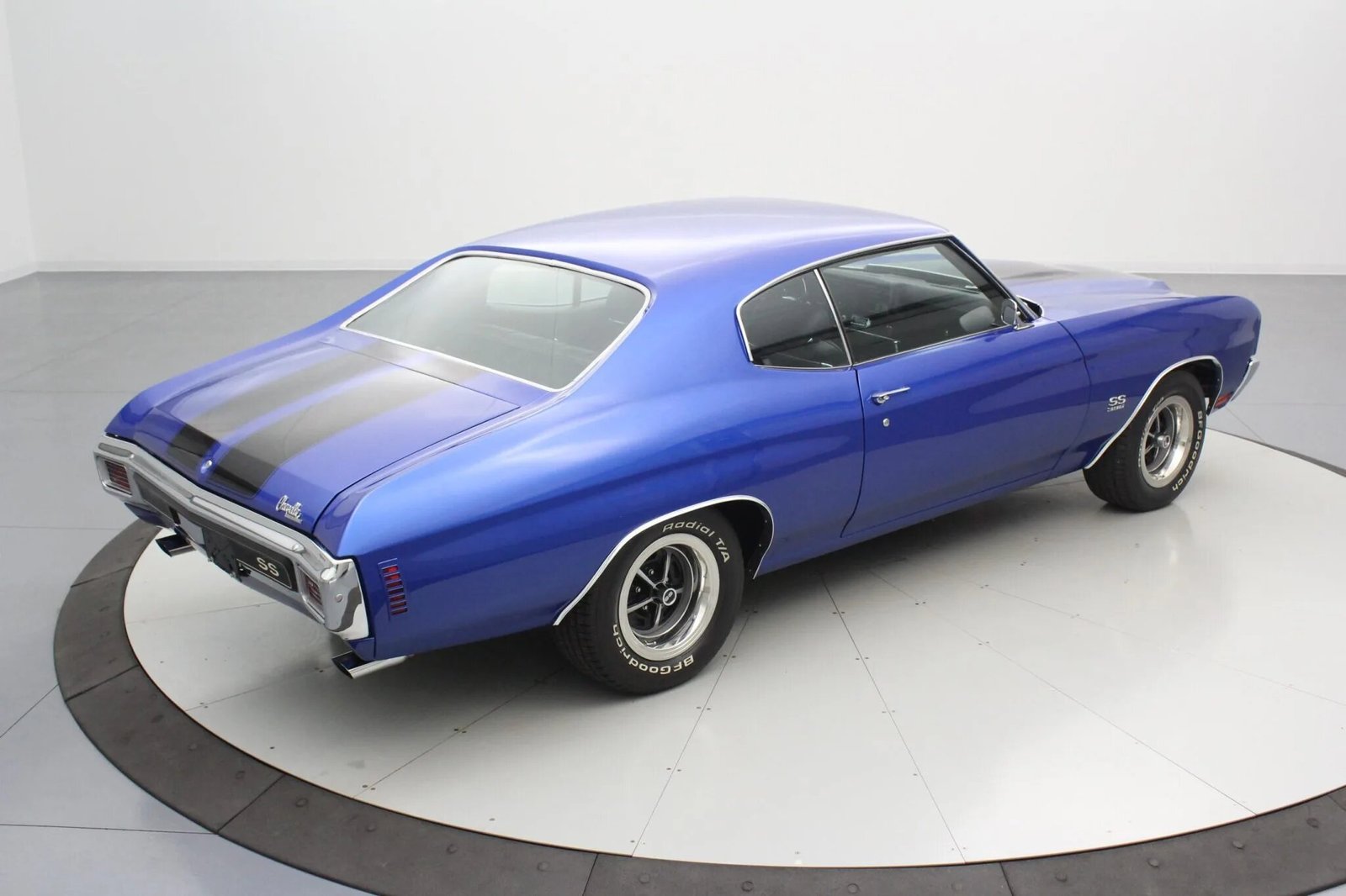 This 1970 Chevrolet Chevelle Malibu Sport Coupe is powered by a 402ci V8 paired with a Muncie four-speed manual transmission and is finished blue with black stripes over black upholstery. The car have been refurbished and features 15″ Rally II-style wheels, power-assisted front disc brakes, power steering, quadruple headlights, chrome trim, air conditioning, and a vintage-look push-button stereo.
