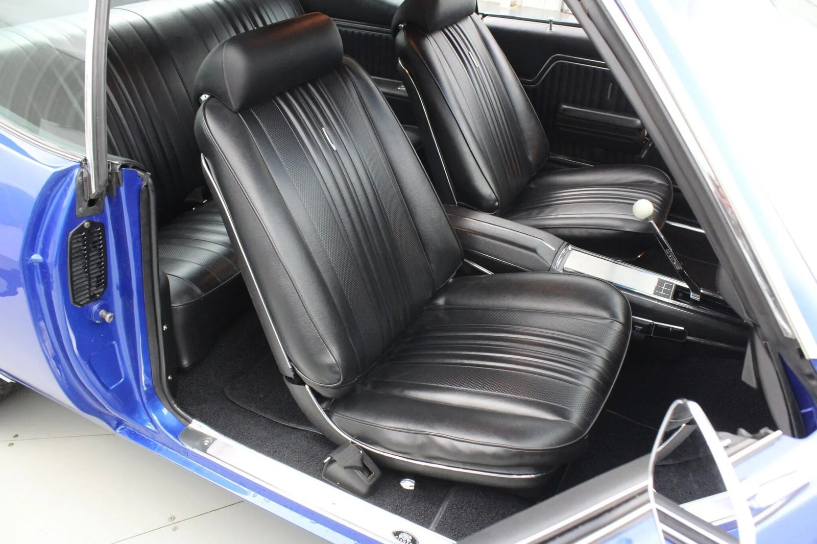 Bright trim lines the center console and door sills, and additional equipment includes air conditioning, a console-mounted shifter, lap belts for four occupants, Chevelle-embroidered floor mats, and a vintage-look push-button stereo.