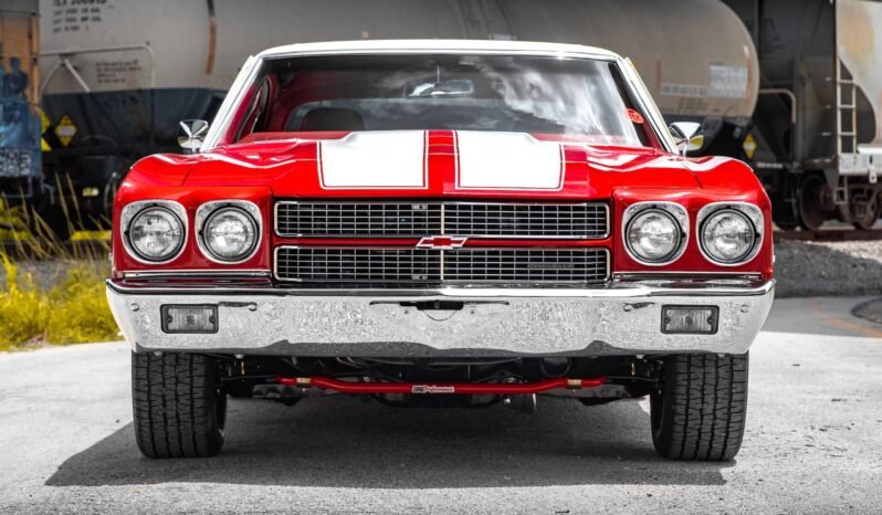 The car features chrome bumpers, a white vinyl roof, dual exhaust outlets, and Malibu fender badging.