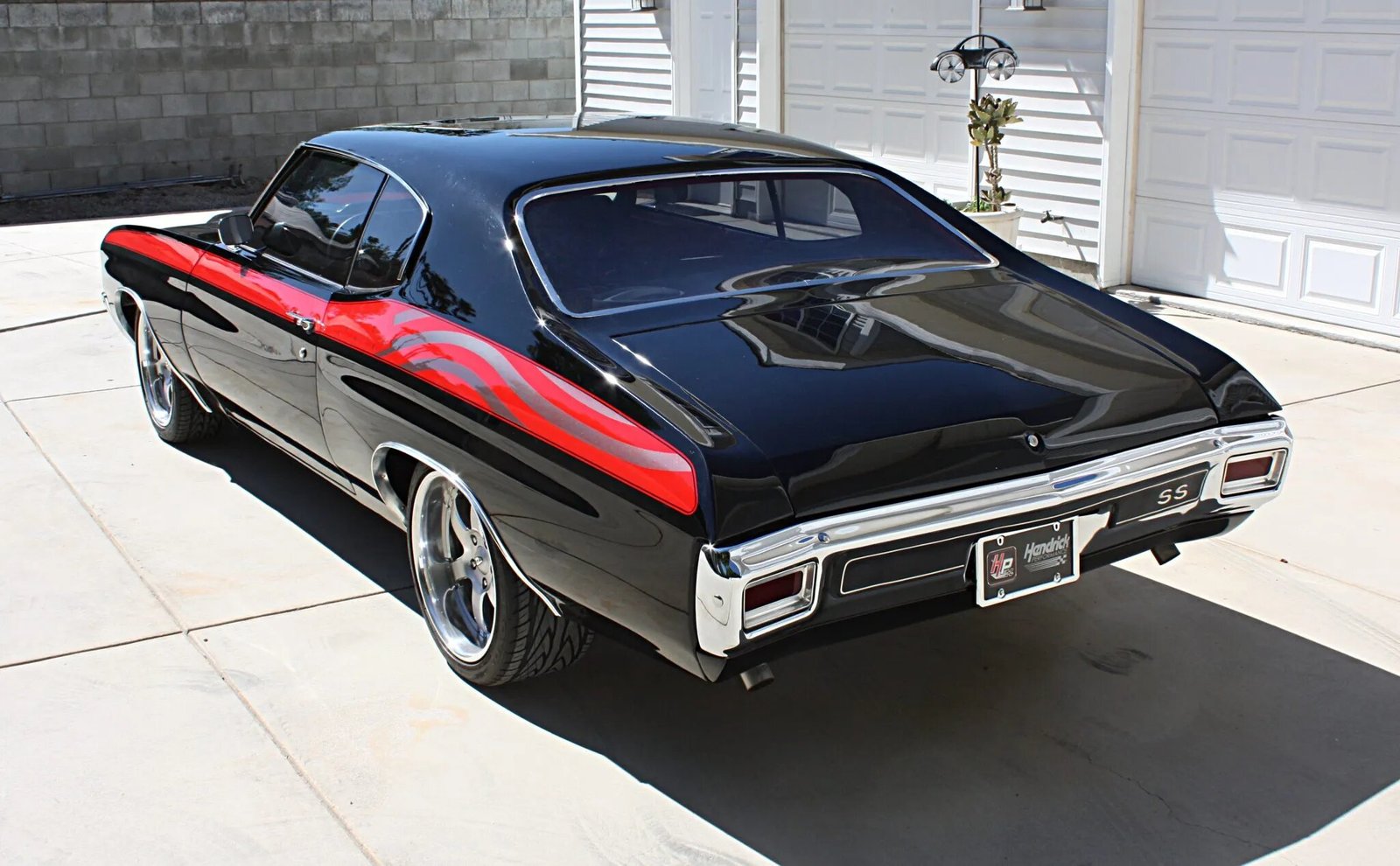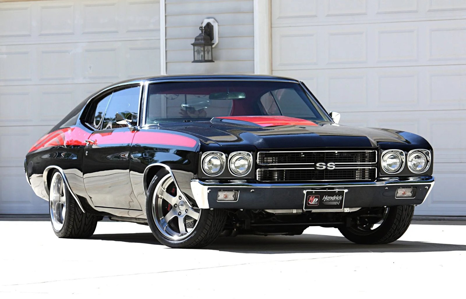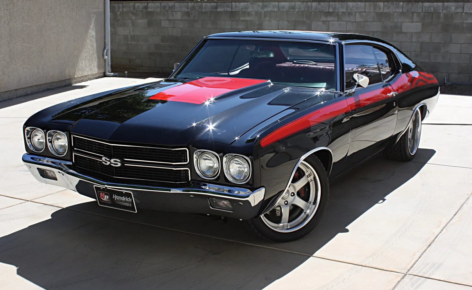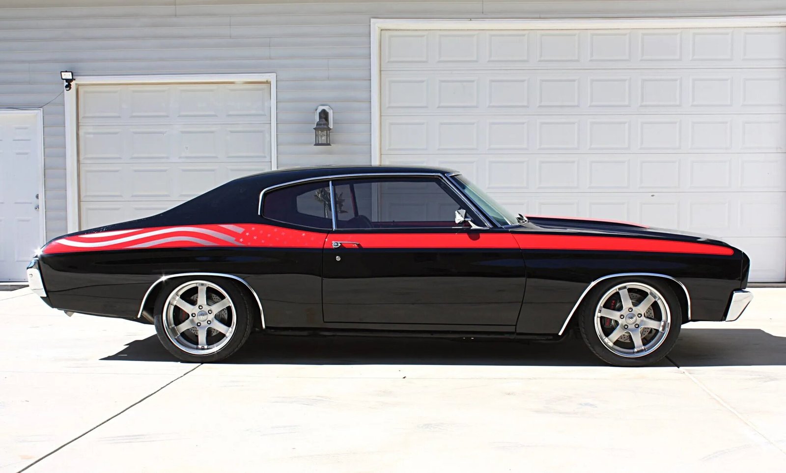 The car is finished in PPG black with red side stripes embellished by gunmetal-gray stars-and-stripes graphics. Features include a red-accented cowl-induction hood, Fesler Built billet hood hinges and taillights, and SS badging as well chrome bumpers, window surrounds, dual mirrors, and wheel-well moldings.