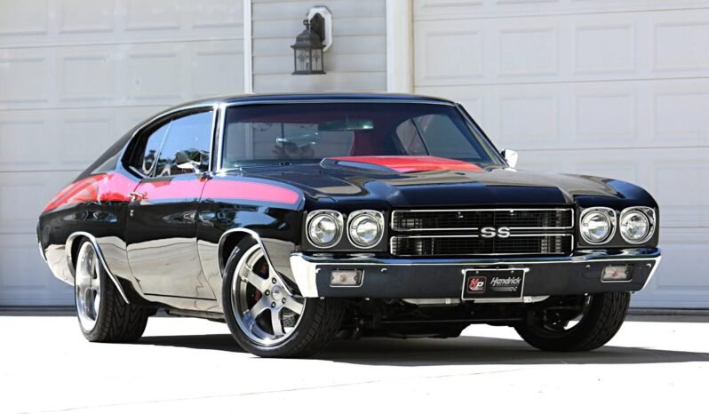 This 1970 Chevrolet Chevelle Malibu sport coupe was built by Route 66 Motorsports, the car is powered by a supercharged 6.2-liter LSA V8 paired with a TCI Automotive six-speed automatic transmission and is finished in black with red side stripes accented by a gray stars-and-stripes theme. Features include an Eaton supercharger, an AutoRad aluminum radiator, a Strange Engineering 9″ rear end, a limited-slip differential, an X-pipe dual exhaust system, Detroit Speed coilovers and Swivel-Link rear control arms, Baer four-wheel power disc brakes, and custom Boze Alloys 18″ wheels along with a Painless Performance wiring harness, a Sony Xplod audio system, an Old Air Products air-conditioning system, power windows, and Classic Instruments gauges.