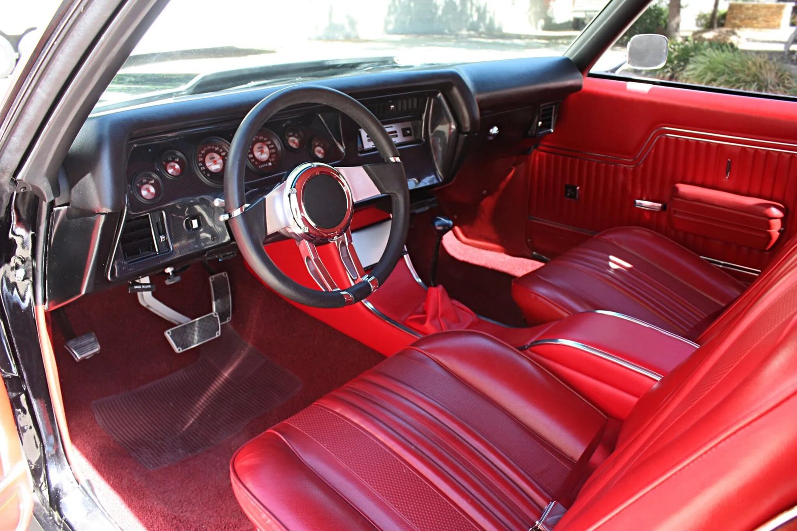 The cabin features front bucket and rear bench seats trimmed in red vinyl with a matching center console, door panels, and headliner. Red carpeting overlays Thermo-Tec Cool It heat and sound insulation on the floors, firewall, and toeboard. Additional features include power windows with Specialty Power Windows regulators, a carbon-fiber-style dash panel, a Sony Xplod audio system, and a Clayton Machine Works pedal set with a drive-by-wire accelerator pedal.