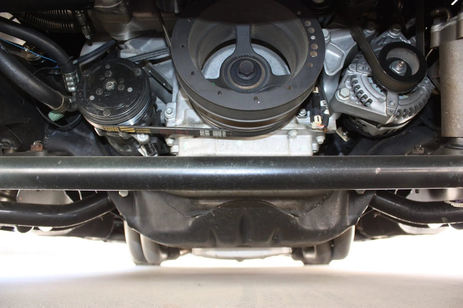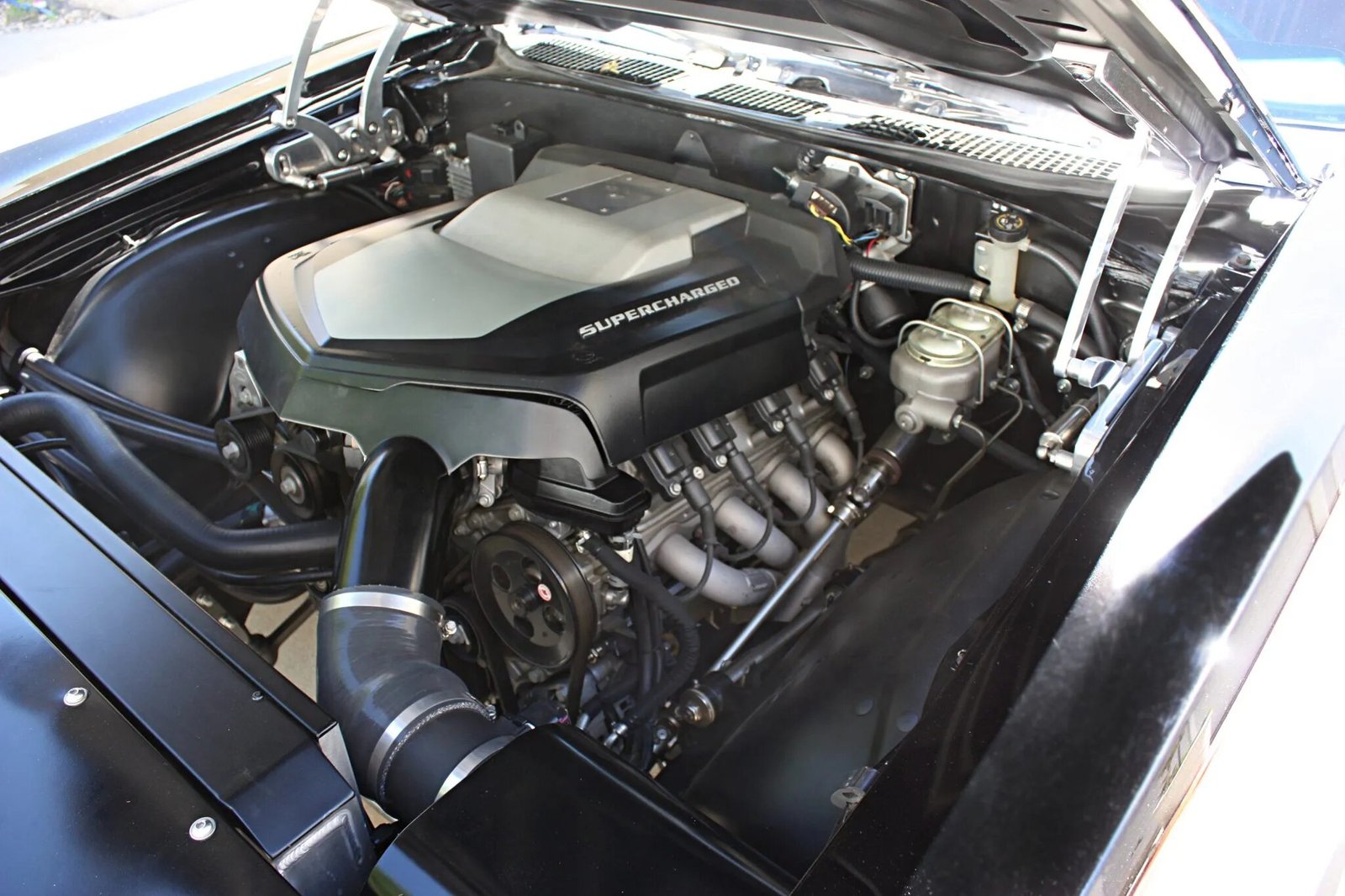 The 6.2-liter LSA V8 crate engine is secured by Edelbrock mounts and features an aluminum block and cylinder heads along with an intercooled 1.9-liter Eaton supercharger, a K&N high-flow air filter, and a dual-pressure fuel system. Cooling is provided by an AutoRad aluminum radiator with an integrated transmission cooler and air-conditioning condenser as well as twin Maradyne High Performance fans. The stainless-steel Edelbrock exhaust system features ceramic-coated long-tube headers flowing into a dual pipes equipped with an X crossover and offset TTI mufflers.