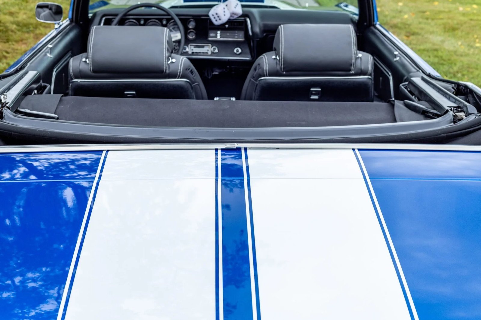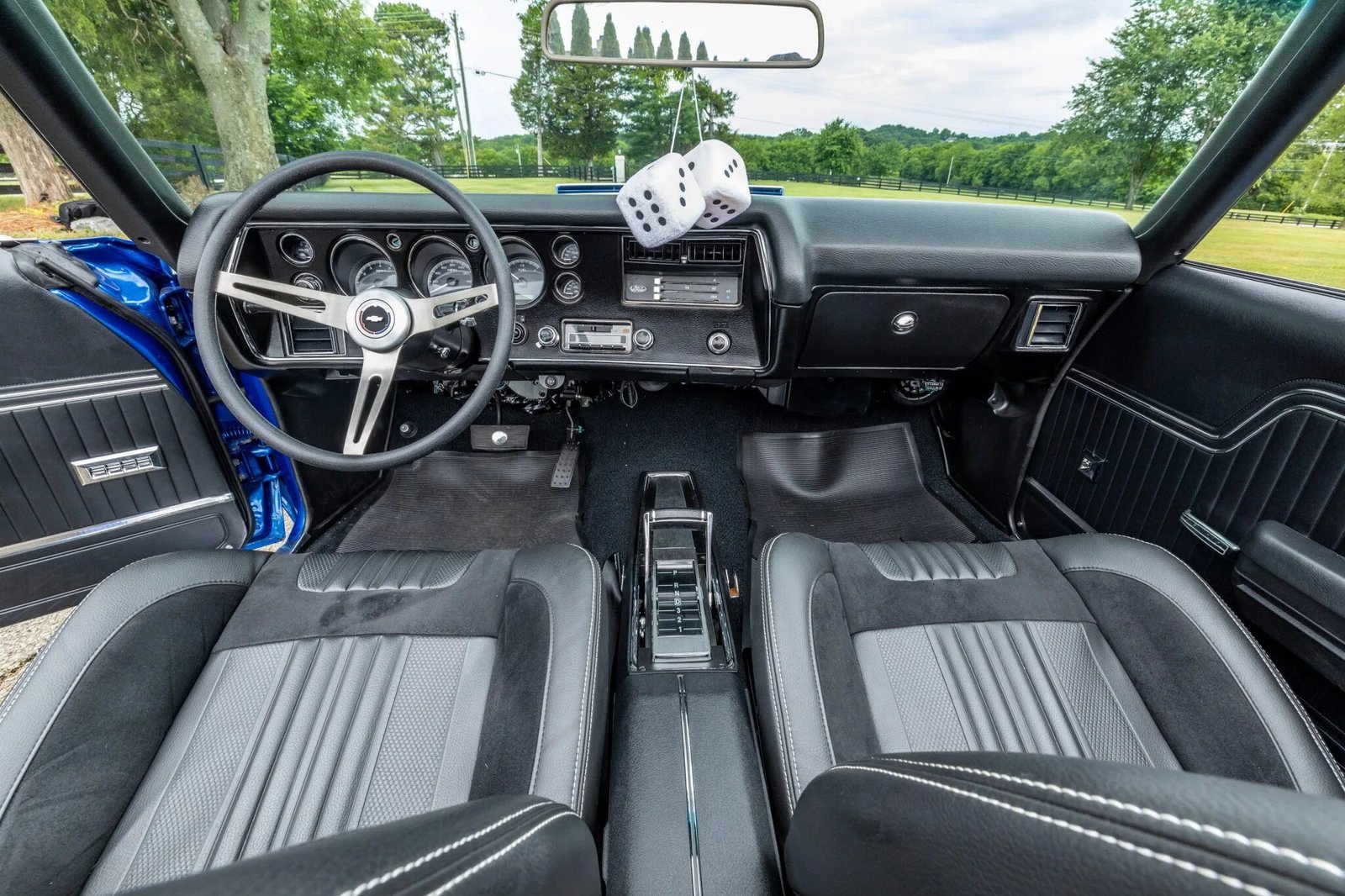 Additional features include Vintage Air climate control, a vintage-look stereo, power windows, black carpeting with Chevelle-branded floor mats, and a center console with a “horseshoe” shifter.