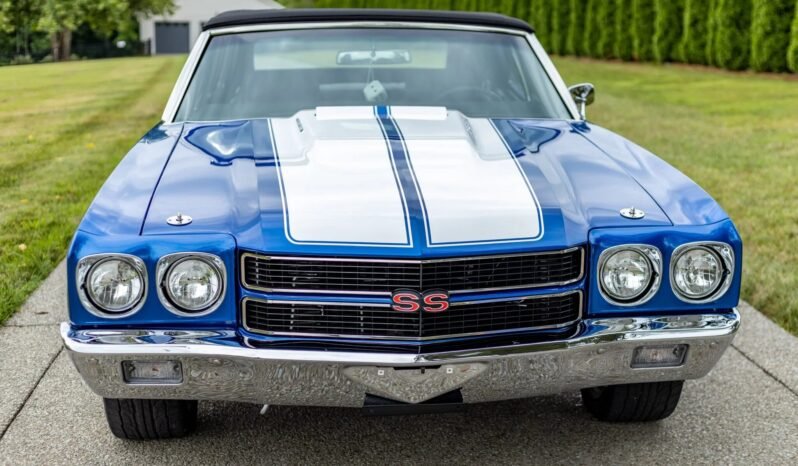 Additional features include a cowl-induction hood secured with hood pins along with tinted glass, chrome bumpers, SS-style emblems, and a power-operated black cloth top with a glass rear window.