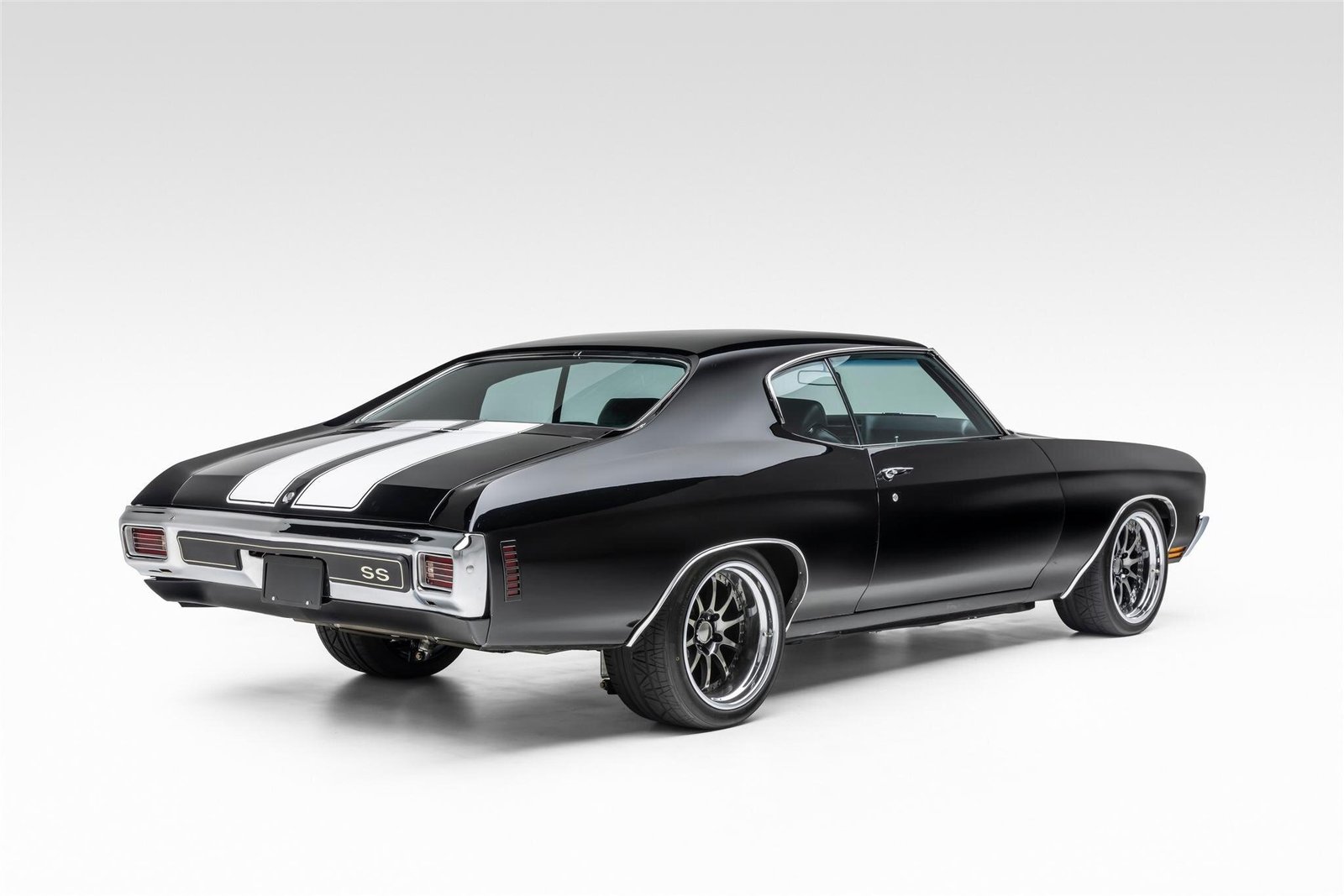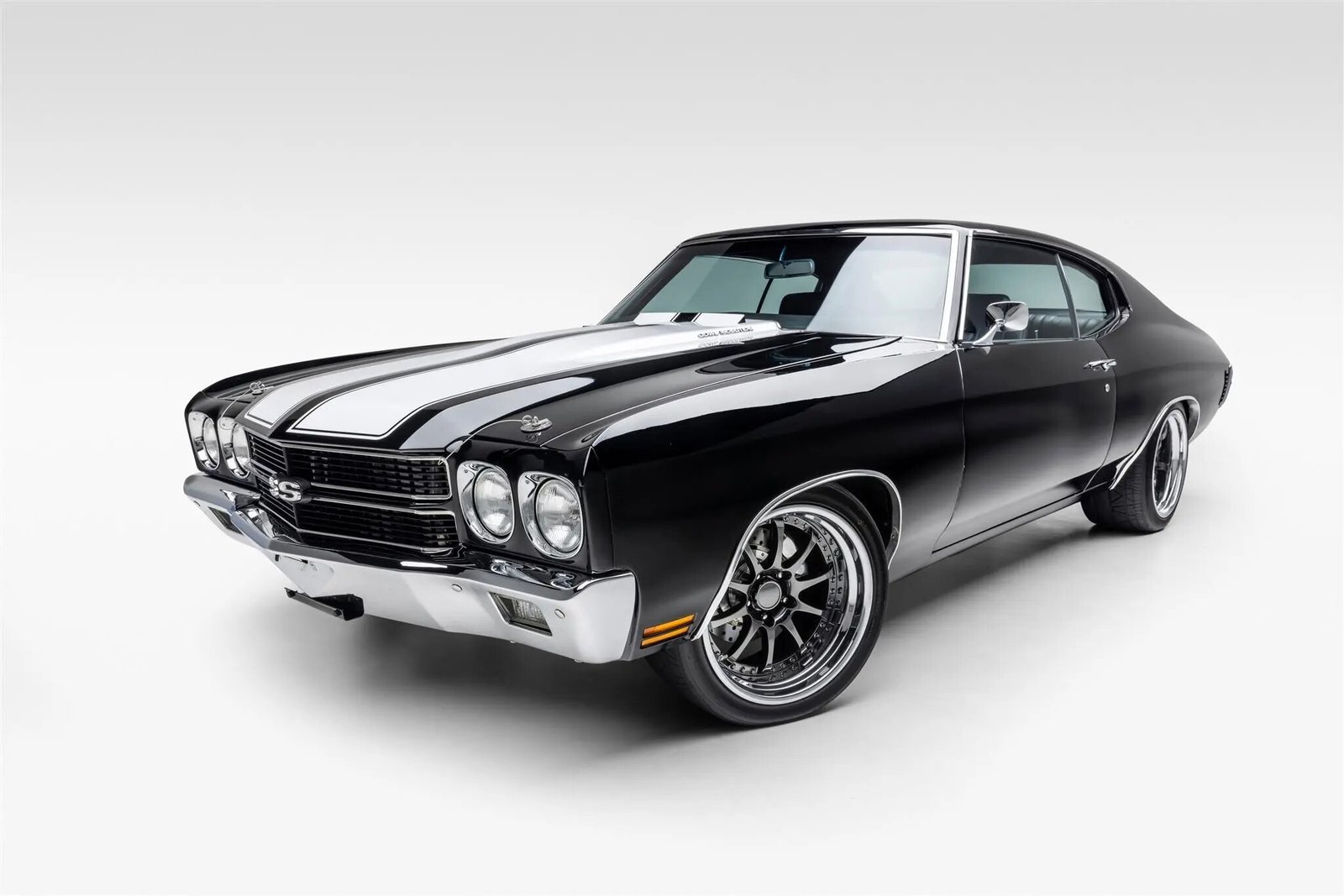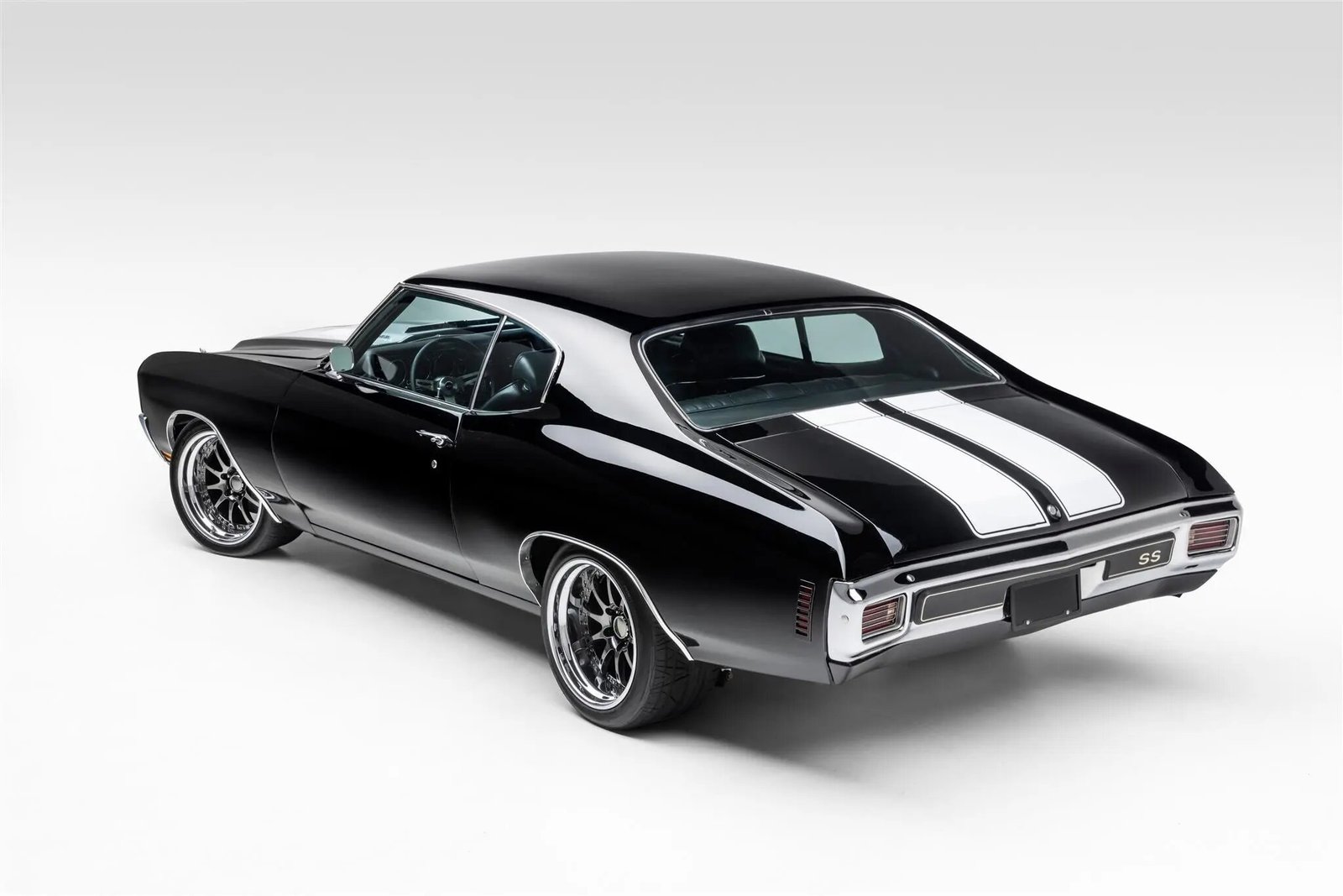 Details include SS badging, a black rear tail panel and front grille inserts, chrome bumpers, and a cowl-induction hood with pins.