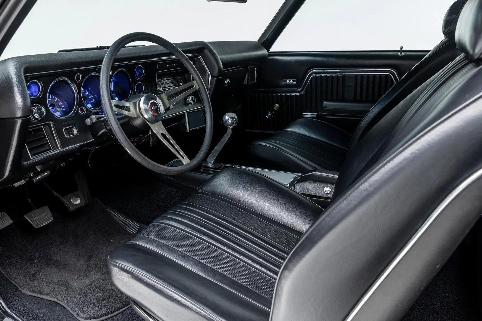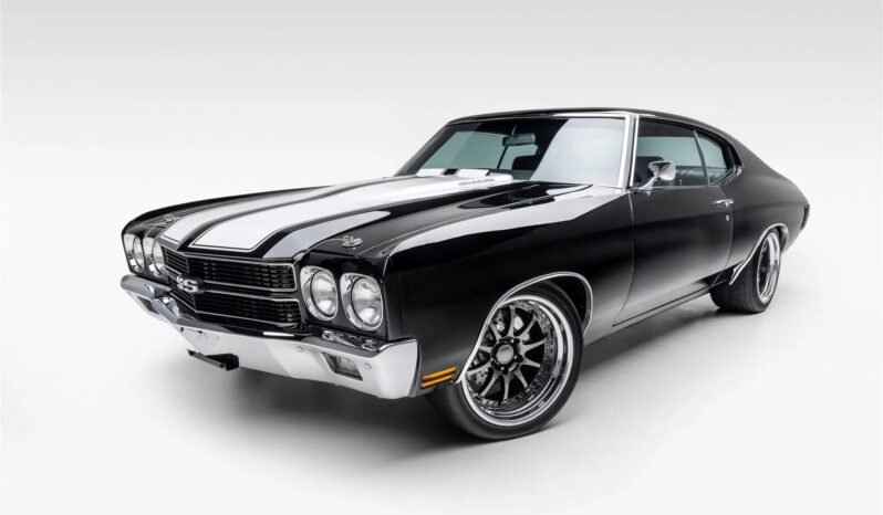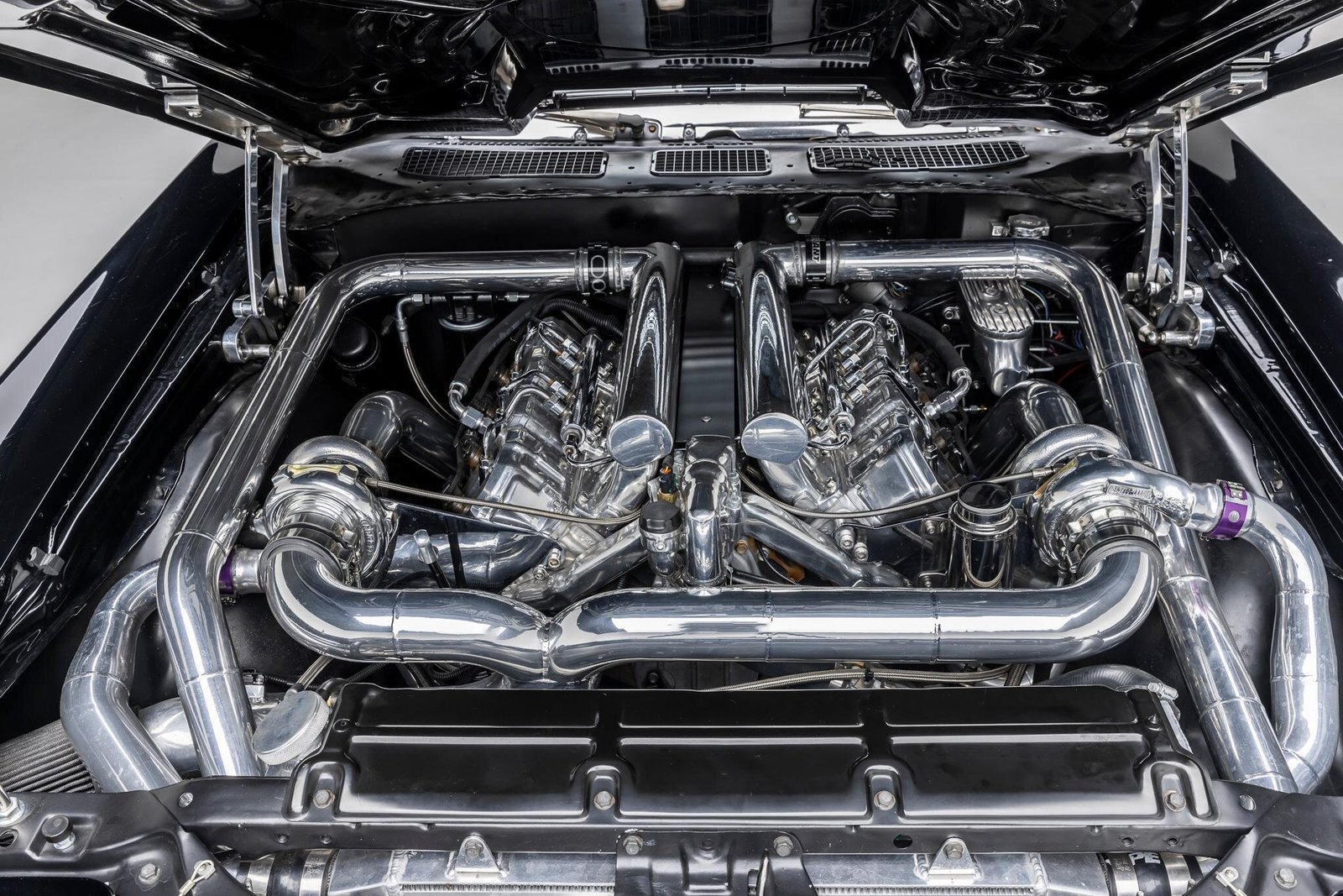 This 1970 Chevrolet Chevelle Malibu is a black-over-black sport coupe that is powered by a twin-turbocharged 6.6-liter Duramax diesel V8 linked to a G-Force five-speed manual transmission and a limited-slip differential. Additional equipment includes a dual-disc clutch, a Chris Alston’s Chassisworks 9″ rear axle, twin Garrett turbochargers, an aluminum radiator, an intercooler, stainless-steel exhaust headers, polished and chrome underhood components, 18″ Foregline wheels, four-wheel disc brakes, Wilwood brake calipers, rear traction bars, Aldan American rear coilovers, a CTS2 digital gauge monitor, and a retro-style head unit.