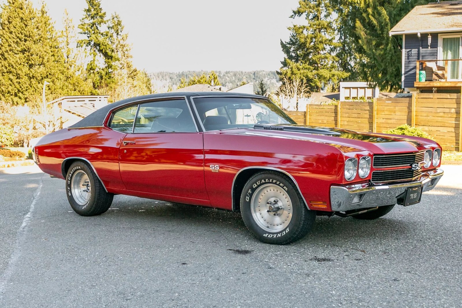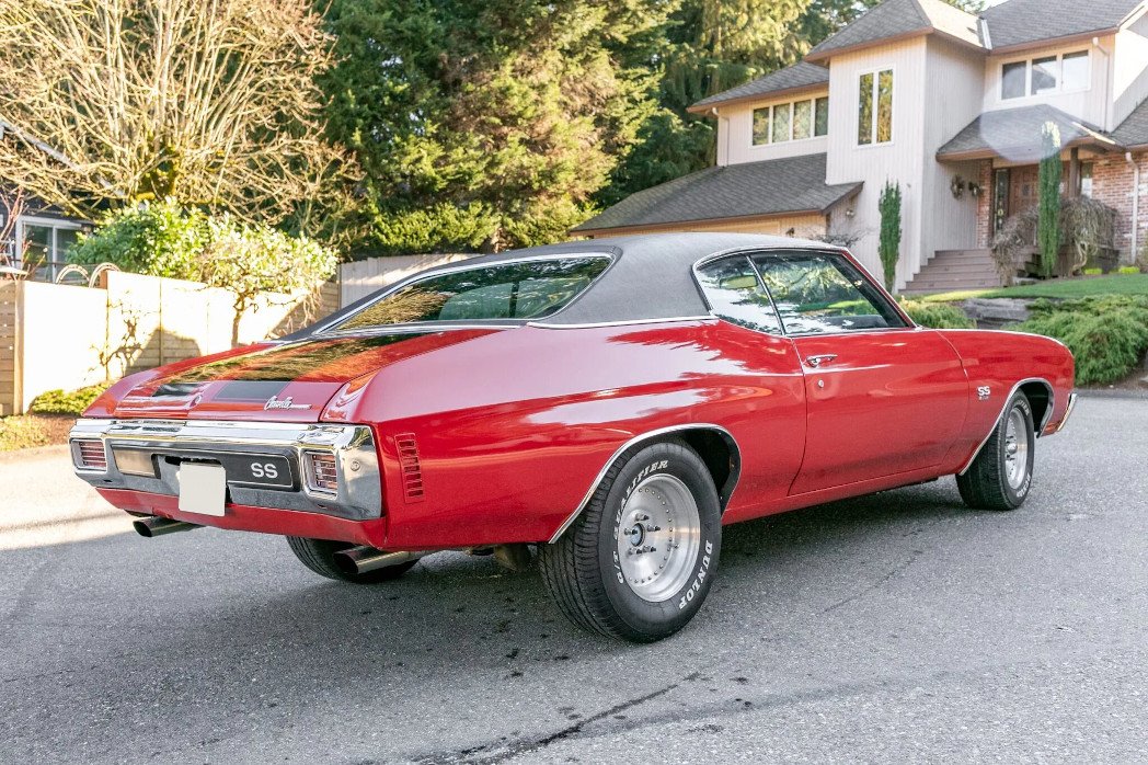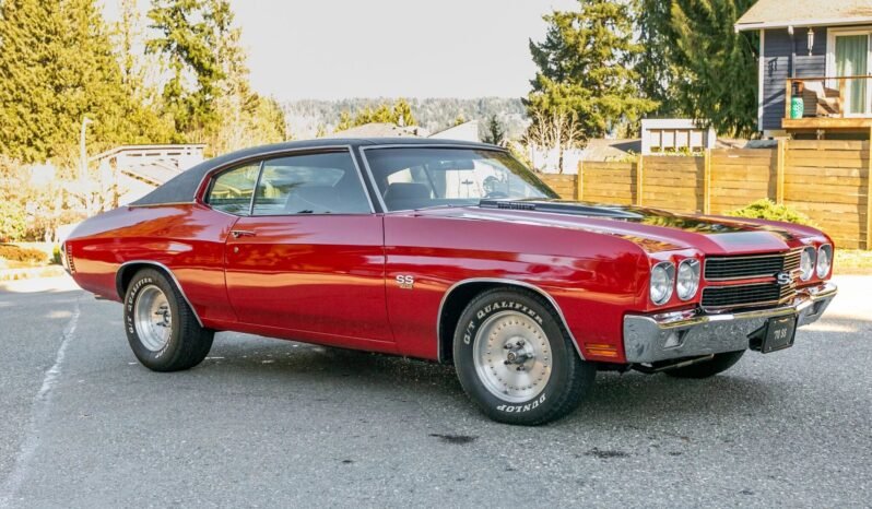 This 1970 Chevrolet Chevelle Malibu sport coupe is finished in red with black stripes over a black vinyl interior and is powered by a fuel-injected 502ci V8 Ram Jet crate engine linked with a TH400 three-speed automatic transmission and a Currie nine-inch rear axle. The car was refinished in red with black stripes following bodywork, additional features include a cowl-induction hood, a black vinyl roof, H4 headlamps, Chevelle badging, SS 502 fender badging, and polished dual exhaust outlets.