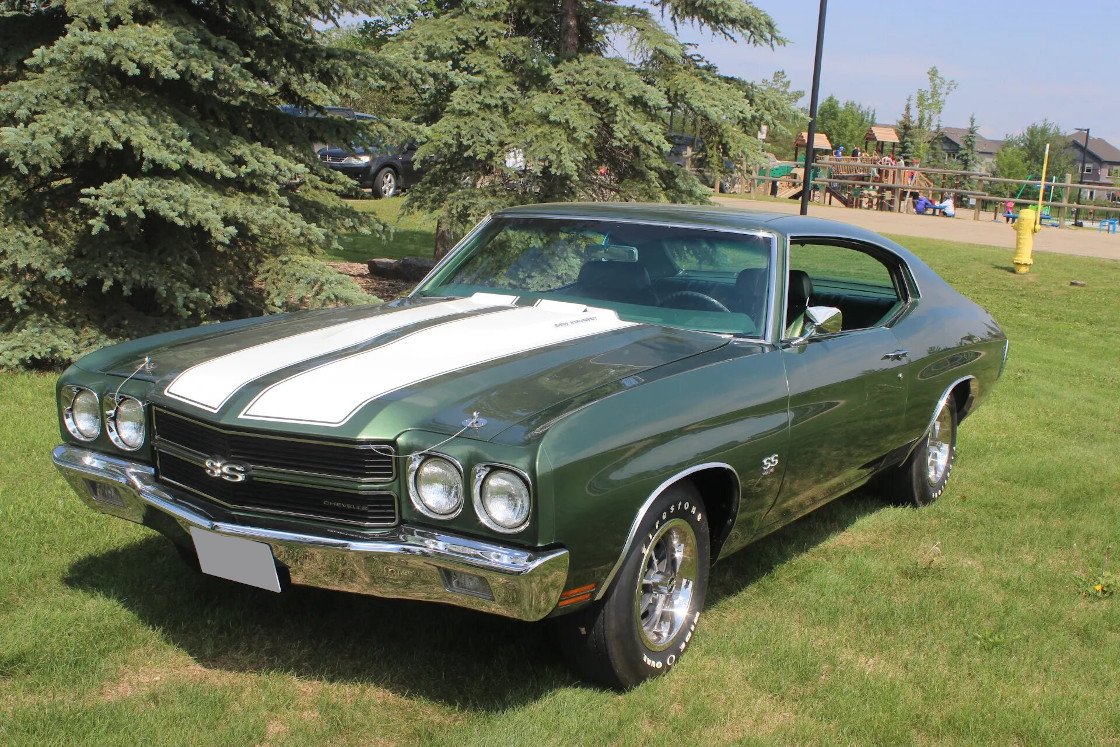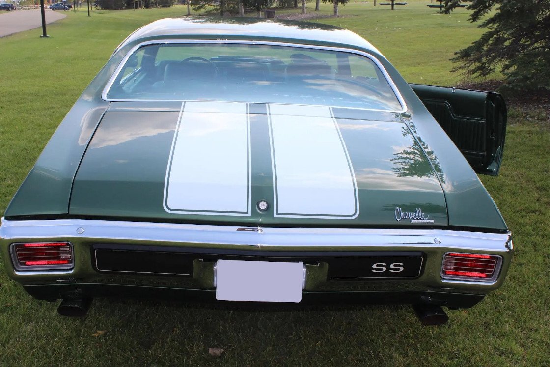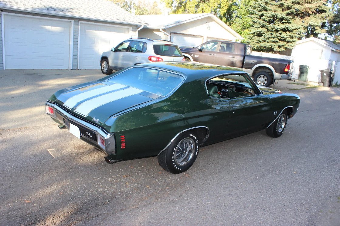 This 1970 Chevrolet Chevelle Malibu SS was subsequently refurbished. Work included repainting the car, powder-coating the frame and suspension components, rebuilding the transmission, replacing the glass, and re-trimming the interior. The car is powered by an LS6 454ci V8 linked with a three-speed automatic transmission and a Positraction differential, and it is finished in green with white stripes over green vinyl upholstery. Features include a cowl-induction hood, a Gardner dual exhaust system, power steering, power-assisted front disc brakes, 14” Super Sport wheels, an analog clock, a push-button AM radio, and power windows.
