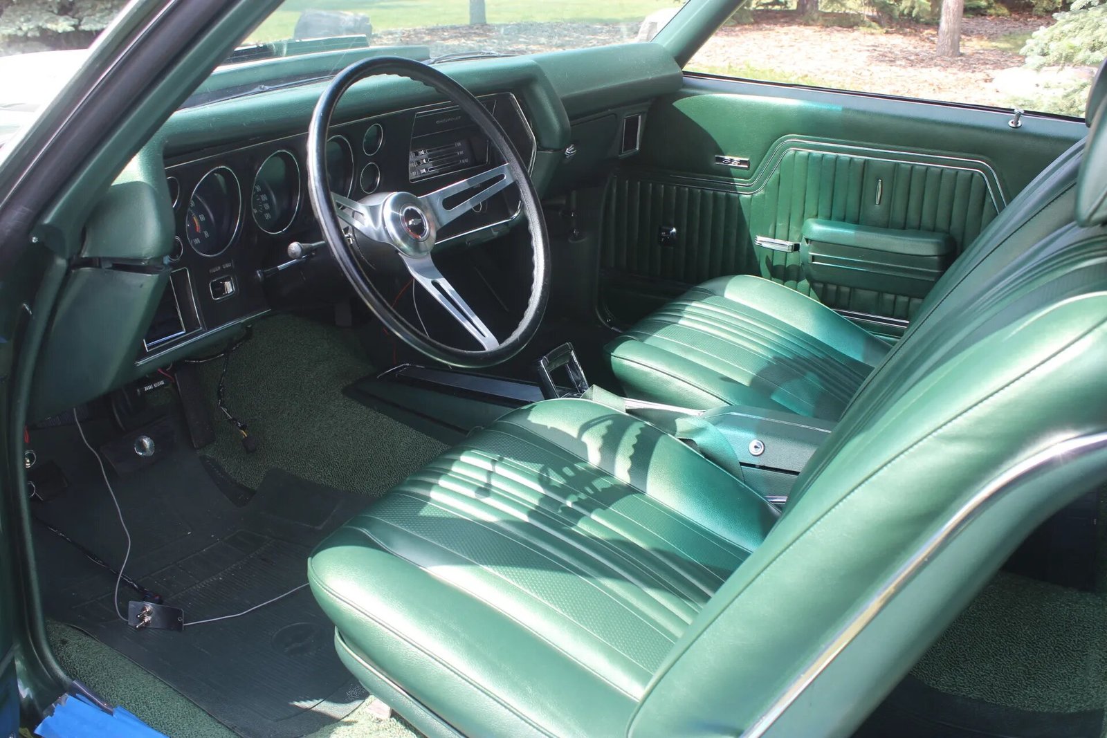 The cabin houses front bucket seats and a rear bench reupholstered in green vinyl and accompanied by a color-coordinated dashboard, headliner, and door panels. Equipment includes a center console, a push-button radio, a horseshoe-style shifter, power windows, lap belts, and Chevrolet-branded black rubber floormats. Legendary Interiors components were used to re-trim the interior. A toggle switch and wiring are hanging down below the left side of the dashboard.