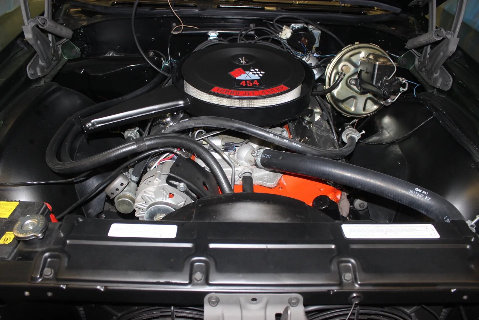The LS6 454ci V8 was factory-rated at 450 horsepower and 500 lb-ft of torque and features a cowl induction system, a four-barrel carburetor, an aluminum intake manifold, and chrome valve covers.