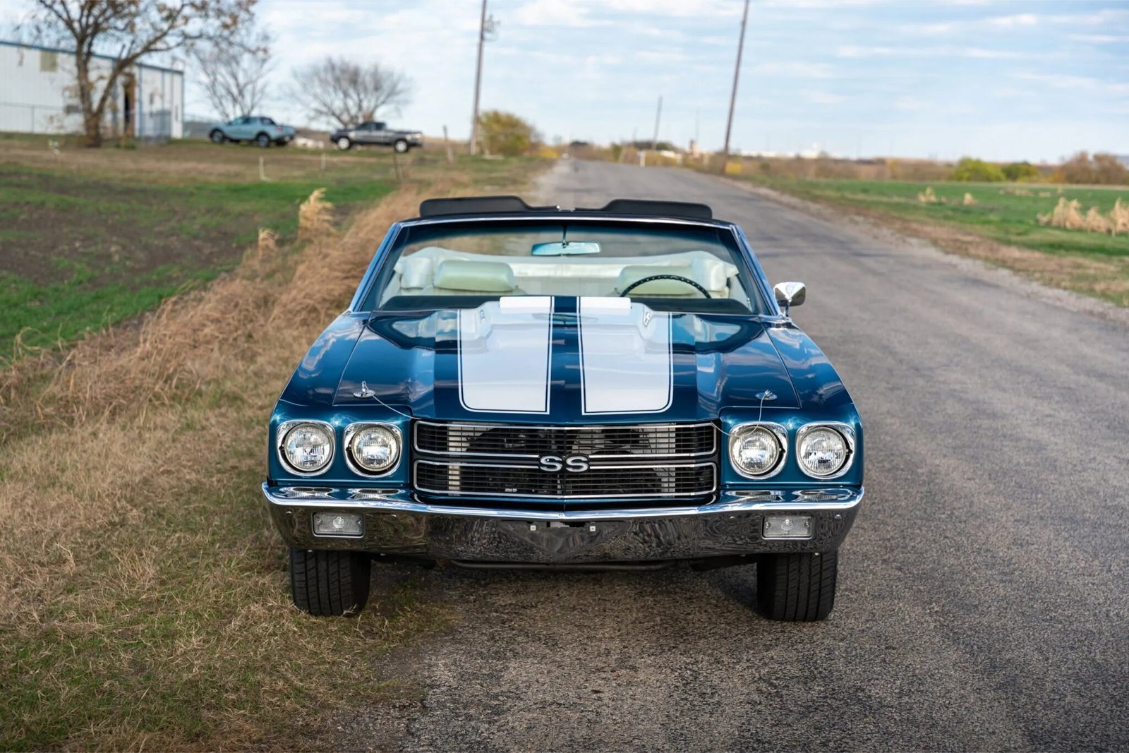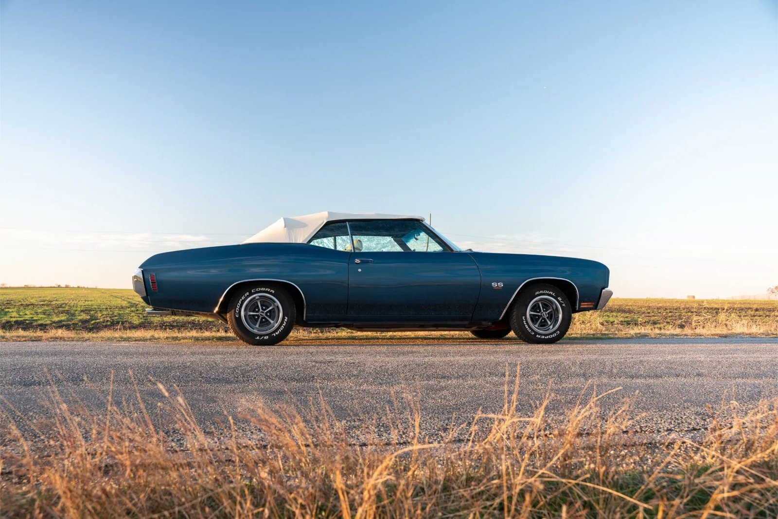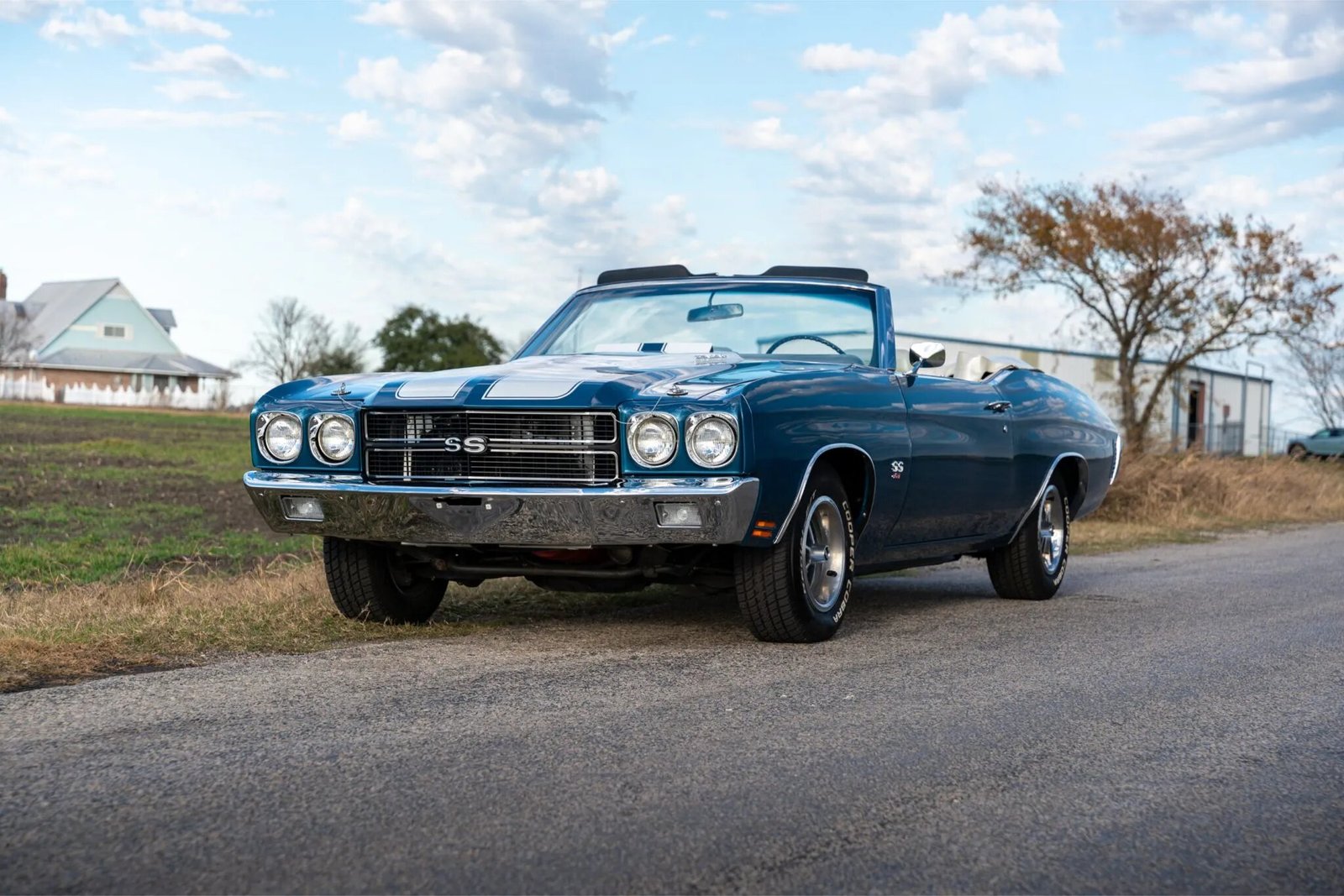 This 1970 Chevrolet Chevelle Malibu convertible underwent a refurbishment in 2014, the car is finished in Fathom Blue with white stripes over pearl white vinyl and powered by a replacement 454ci V8 paired with a Muncie M22 four-speed manual transmission and a 12-bolt Positraction rear axle. Additional equipment includes a white soft top, a cowl-induction hood, SS badging, 15″ Super Sport wheels, front disc brakes, power steering, front bucket seats, a Hurst shifter, and an AM radio.