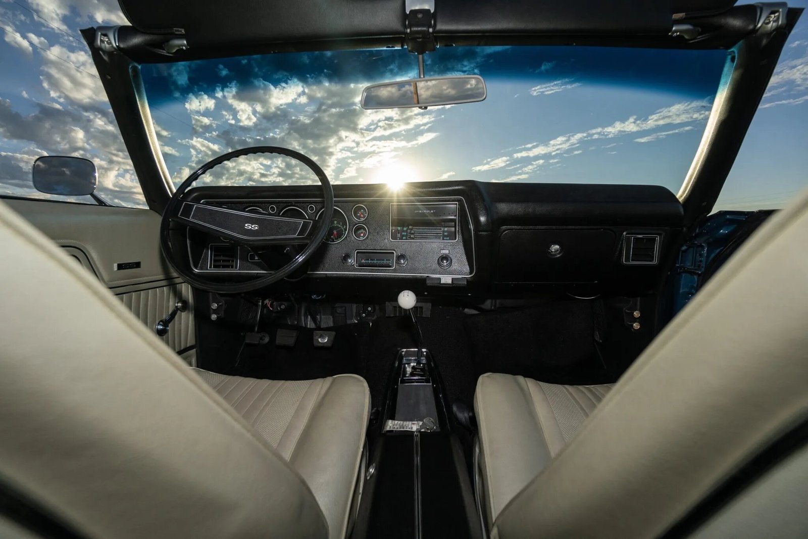 The front bucket seats and rear bench are upholstered in ivory vinyl and accompanied by a color-coordinated dashboard and door panels. Equipment includes a center console, a push-button radio, a Hurst shifter, lap belts, and SS-branded black floormats.