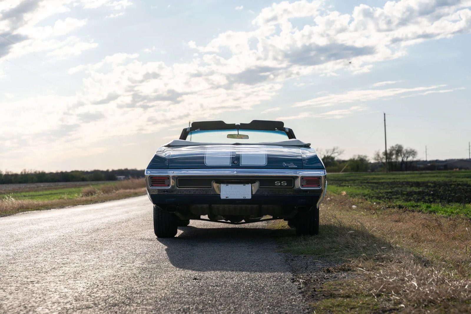 The car was repainted in Fathom Blue with white stripes during the aforementioned refurbishment in 2014. Equipment includes a manually-operated white soft top, a matching top boot, a black grille and tail panel, chrome bumpers, quad headlamps, hood pins, SS 454 badging, and polished dual exhaust finishers.
