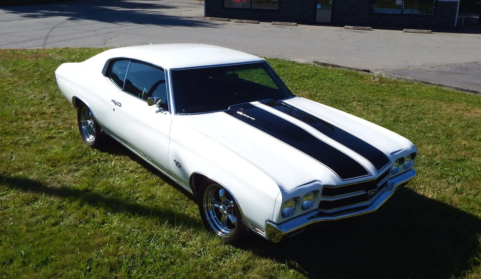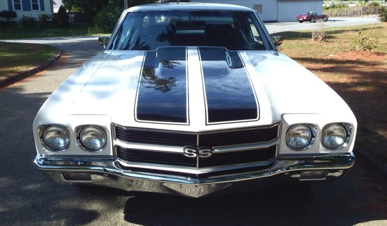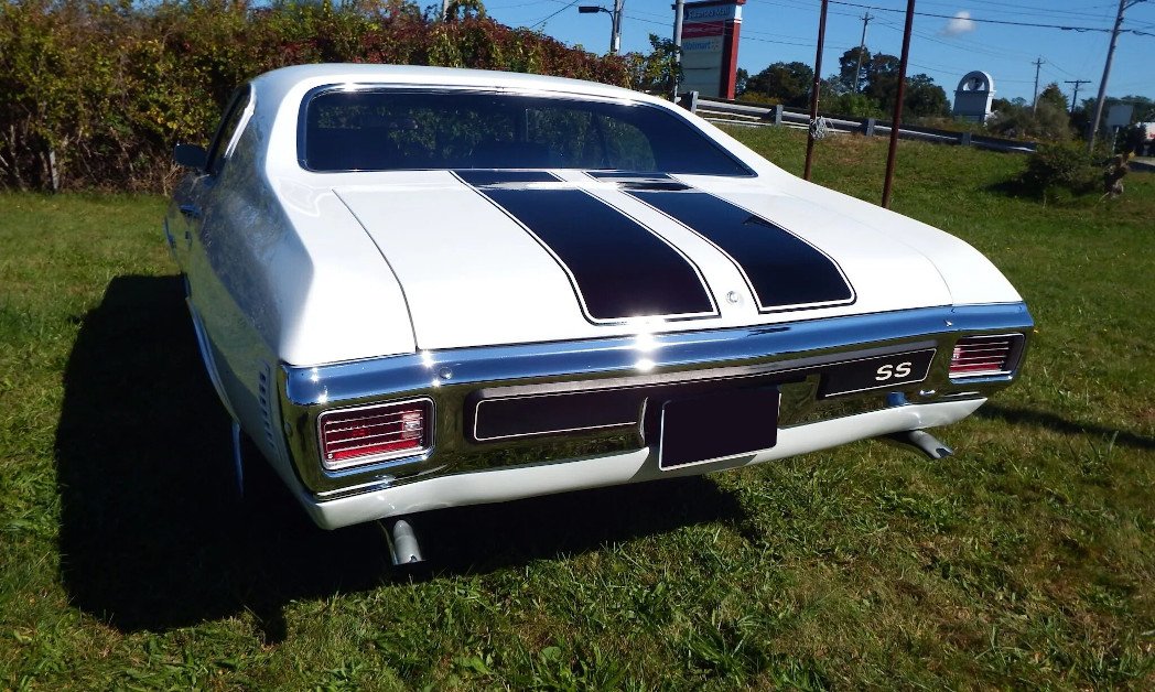 The body is finished in white with black hood and decklid stripes and have been repainted. Features include a cowl induction hood, an SS grille and tail panel, chrome bumpers, quadruple headlamps, and a dual outlet exhaust that exits below the rear bumper.