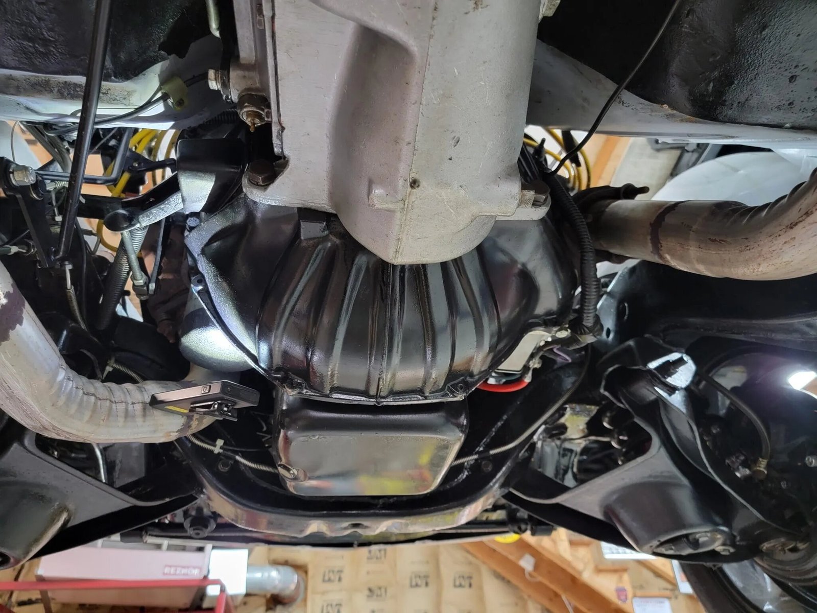 The 454ci V8 features electronic ignition, a polished intake manifold, an aluminum radiator, a chrome air cleaner assembly and radiator cover, and white valve covers. A fluid service was performed in preparation for sale. Power is delivered to the rear wheels through a Muncie four-speed manual transmission and a 10-bolt rear axle.