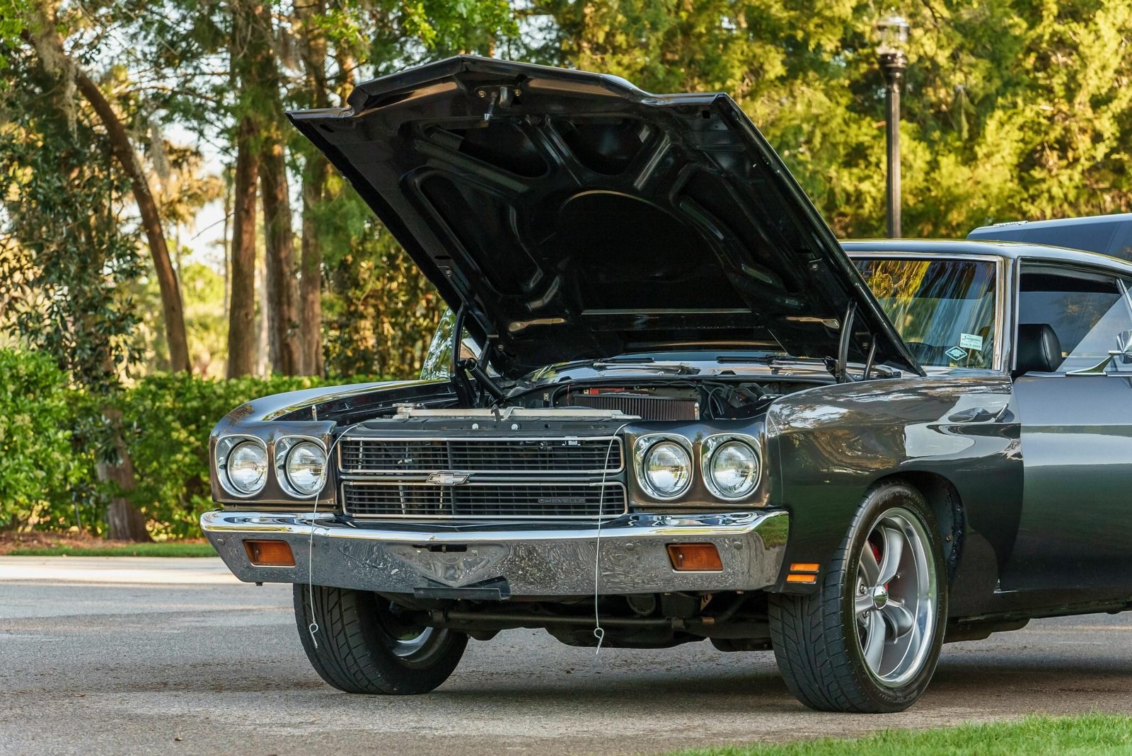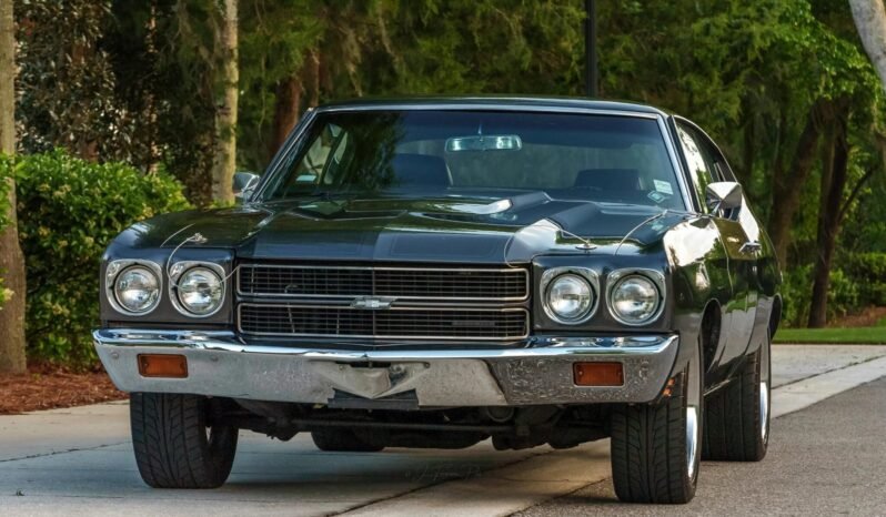 This 1970 Chevrolet Chevelle Malibu sport coupe is powered by a replacement BluePrint Engines 383ci V8 mated with a four-speed manual transmission and is finished in gray with black stripes over black vinyl upholstery. Equipment includes Vintage Air climate control, power steering, Wilwood four-wheel disc brakes, QA1 adjustable rear coilovers, 18″ Boss wheels, bolstered front bucket seats, AutoMeter instrumentation, a Hurst shifter, an Edelbrock E-Street EFI system, MSD electronic ignition and distributor, and a dual exhaust system with Flowmaster mufflers.