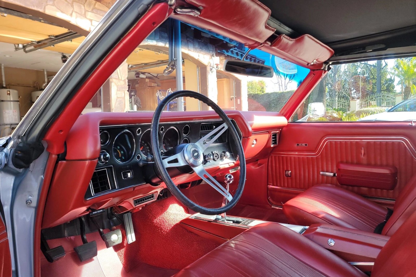 Super Sport-style 15″ wheels wear chrome trim rings and are mounted with 235/60 Coker redline tires.