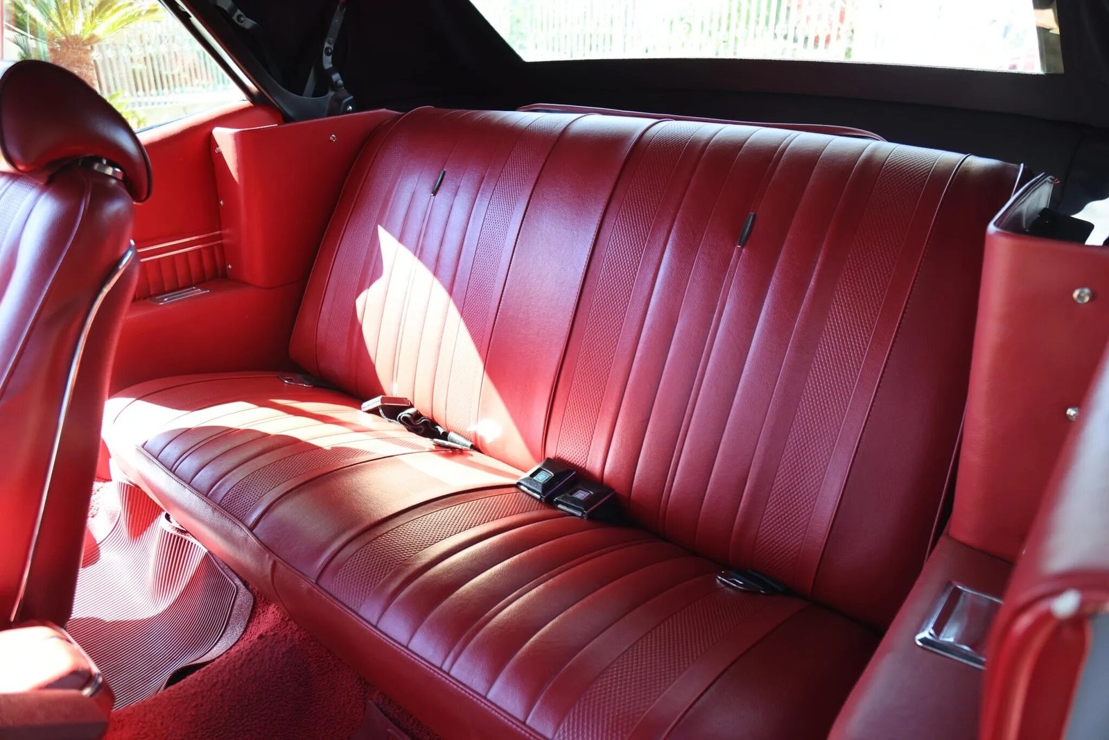 The front bucket seats are finished in red vinyl, and the cabin features a matching rear bench, carpets, and door panels.