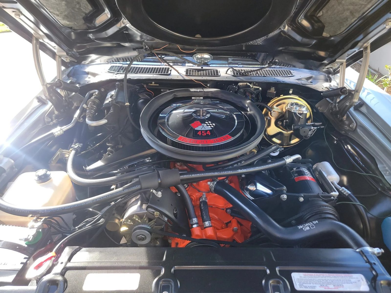 The 454ci V8 features a dual exhaust system and has been fitted with a Holley Sniper fuel-injection system as well as an aluminum radiator.