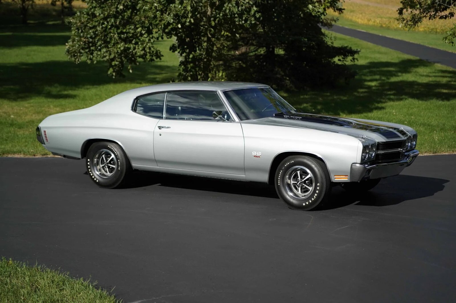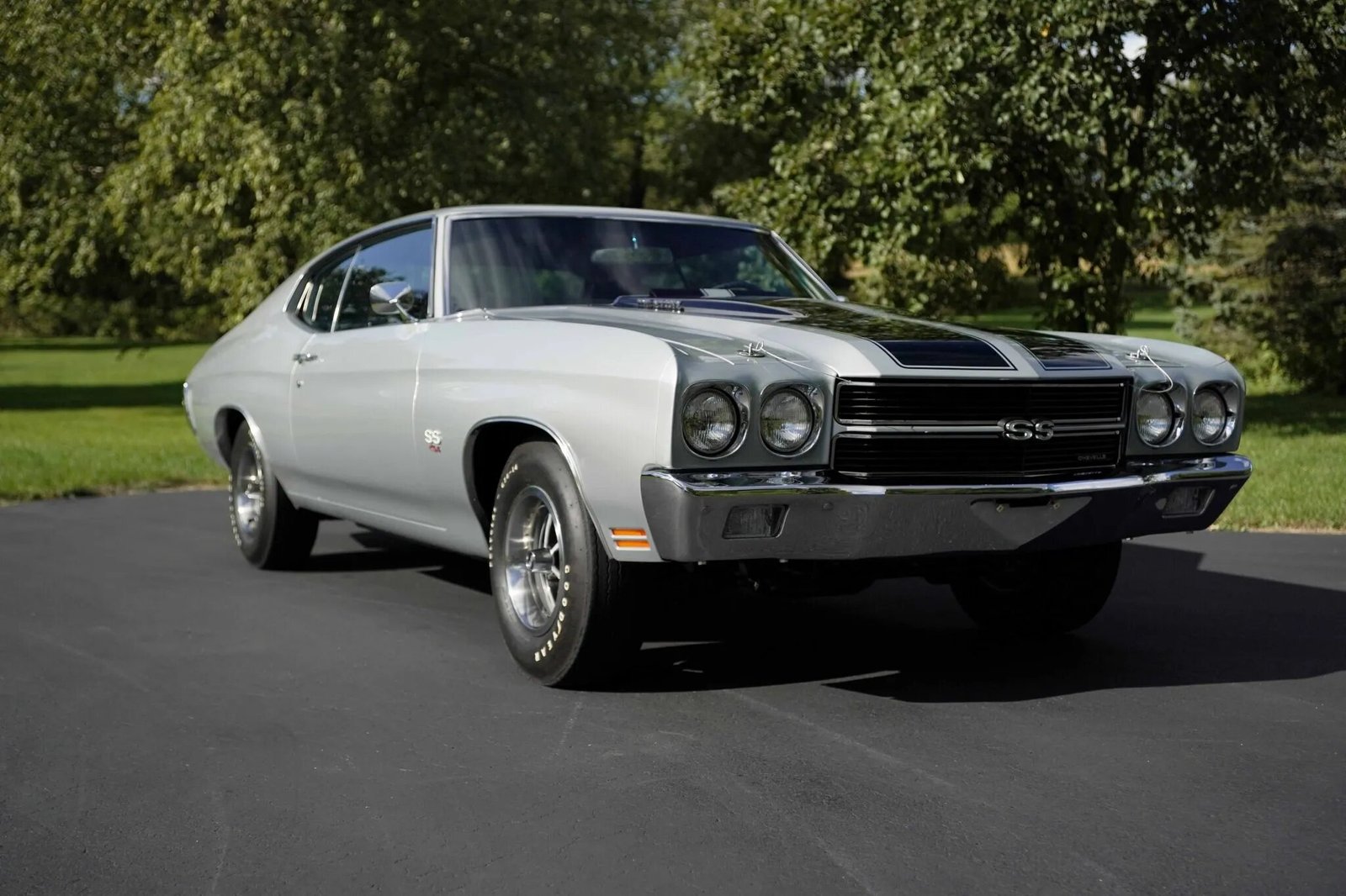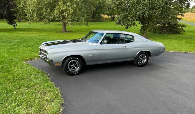 This 1970 Chevrolet Chevelle SS was built at GM’s Atlanta, Georgia assembly plant. Power is supplied by a 454ci LS6 V8 mated with a Muncie M22 four-speed manual transmission and a Positraction rear end. The car is finished in silver with black stripes over black vinyl upholstery and equipped with a cowl induction hood secured with pins, the F41 Special Performance Suspension package, power-assisted steering and front disc brakes, a center console, bucket seats, and 14” Super Sport-style wheels. A refurbishment been performed over two decades ago.