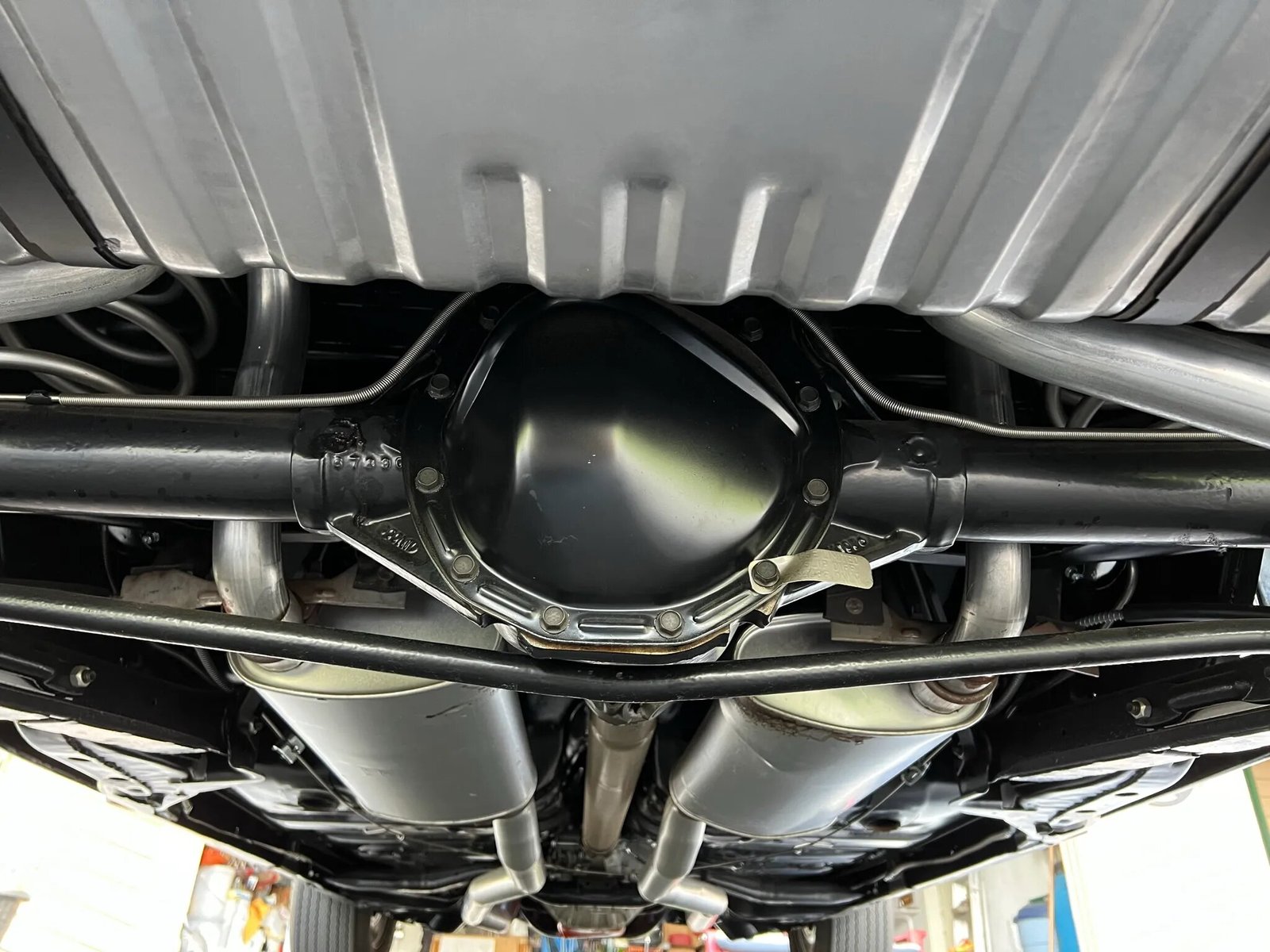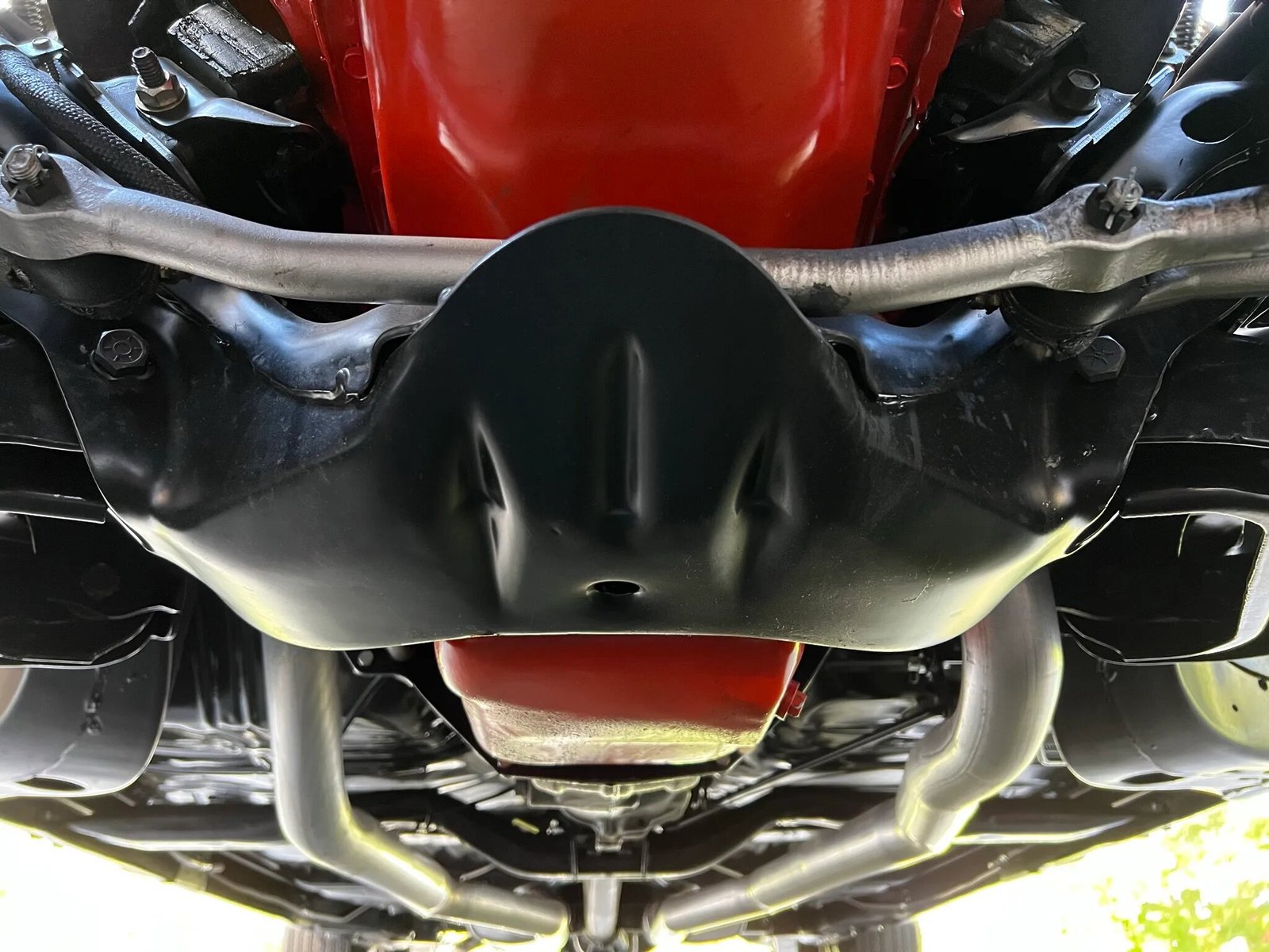 The 454ci LS6 V8 was factory-rated at 450 horsepower and have been rebuilt during the refurbishment. A replacement wiring harness has been installed. The car is fitted with a smog pump. Power is sent to the rear wheels via a Muncie M22 four-speed manual transmission and a 12-bolt rear end housing a G80 Positraction differential with 3.31:1 gearing. The trunk floor was replaced during the refurbishment and the frame was powder coated black.