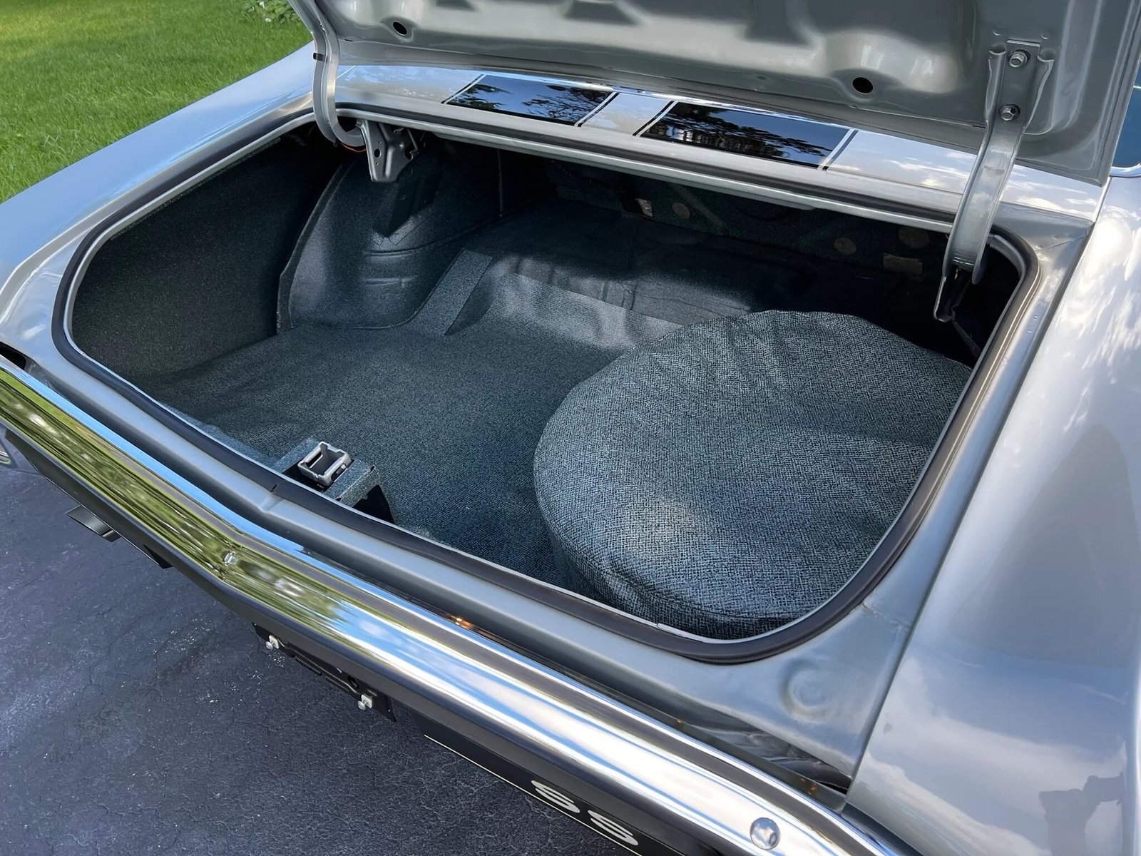 Reproduction 14” Super Sport-style wheels are mounted with Goodyear Polyglas white-letter tires. A full-size spare is found in the trunk. Braking is through power-assisted front discs and rear drums, and the car came optioned from the factory with the F41 Special Performance Suspension package.