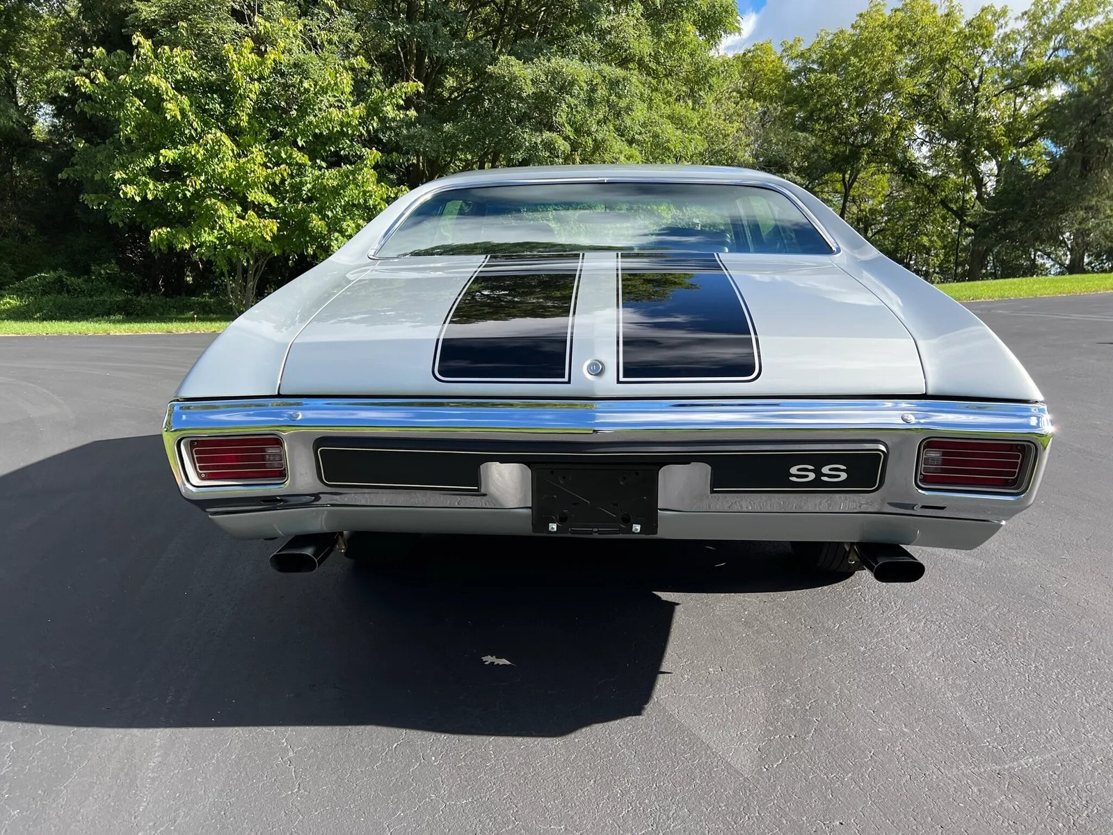 Finished from the factory in Cortez Silver (14), the car have been repainted and fitted with replacement glass. Exterior features include black over-the-top stripes, a cowl induction hood secured with pins, dual exhausts, and SS 454 badging.