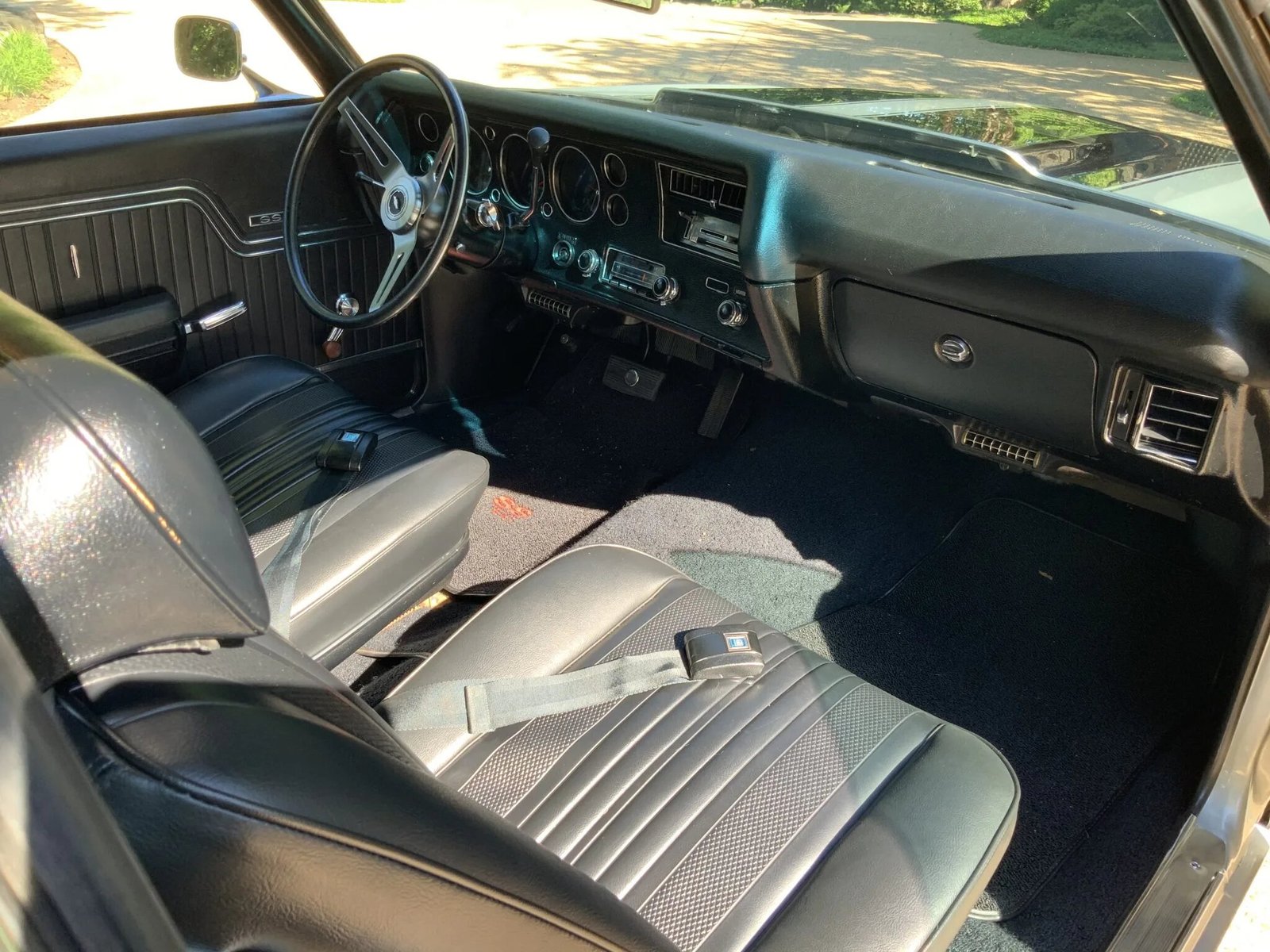 The cabin features front bucket seats and a rear bench trimmed in black upholstery with matching door panels, dashboard, and carpeting.